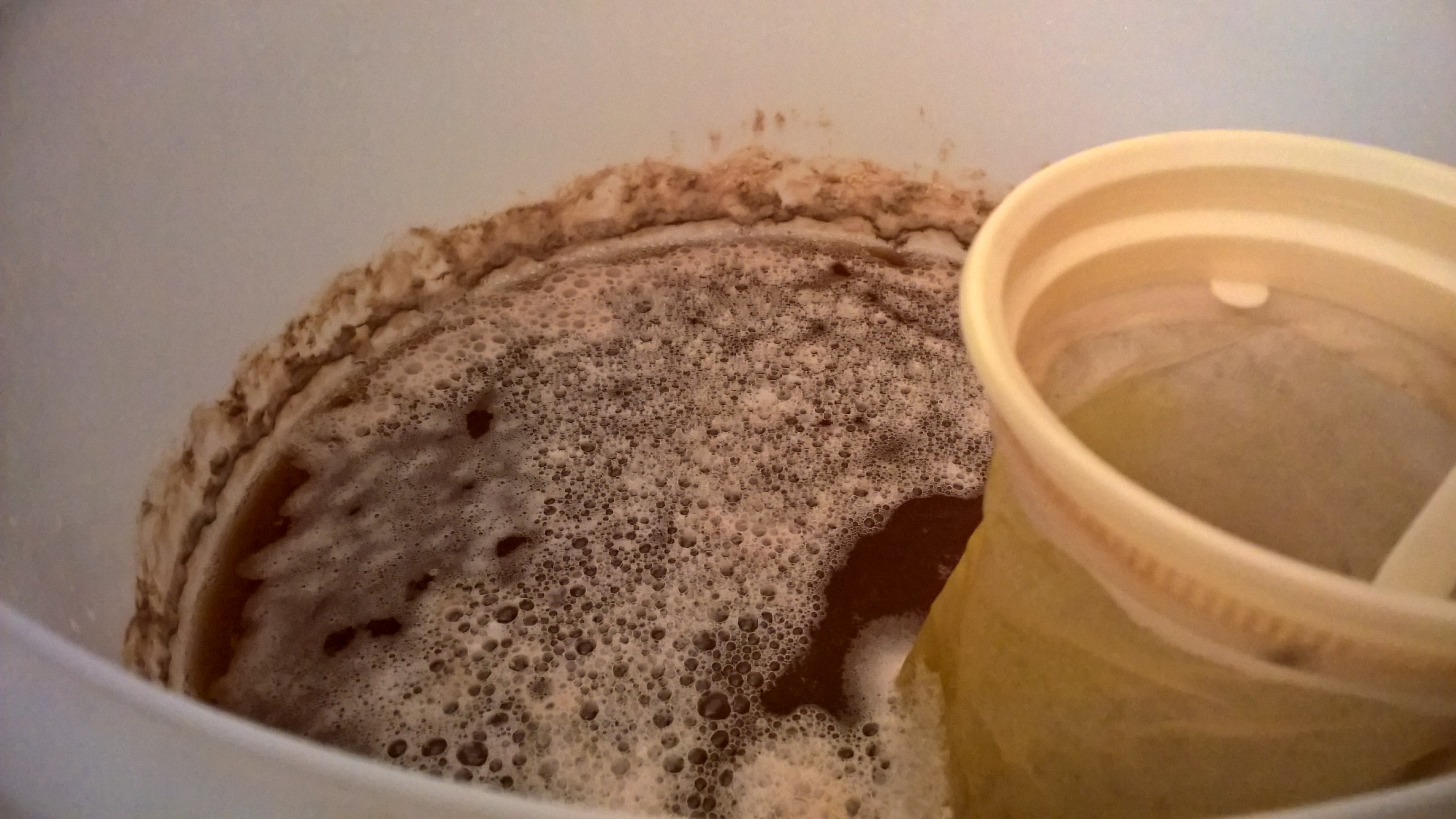 Der Gäreimer steht auf der Terrasse in der Cool Brewing Bag. Netterweise kommt die Gärung jetzt schon an. Die Gärungswärme erspart es mir heute Nacht warme Wasserflaschen rauszuschleppen.
