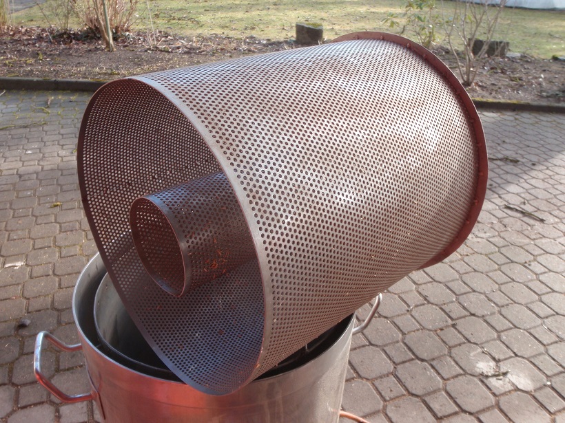 Die Würze wurde bei diesem Projekt von innen nach außen durch den Treber gedrückt. Das Malzrohr hatte AUSSEN die Löcher und das innere Rohr war auch perforiert.