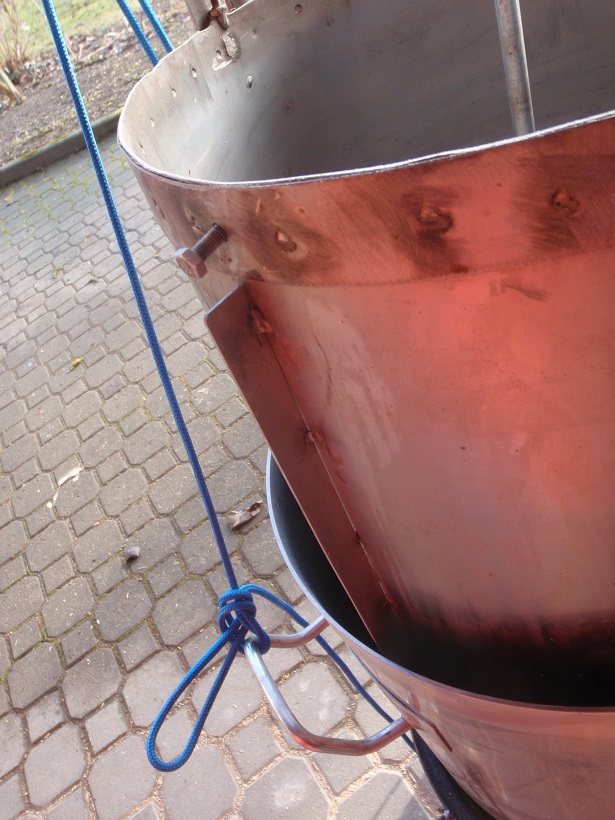 3.Baut euch eine Hebevorrichtung: Der Topf mit Sieb und getränktem Malz ist ganz schön schwer, zufällig hatte ich über meinem Brautopf einen Befestigungspunkt, so konnte ich einen Flaschenzug befestigen und den Topf ohne Mühe aus dem Brautopf herausziehen. Einen abnehmbaren Henkel hatte ich mir schon vorher gebaut. Die Würze läuft über die unteren Bohrungen doch sehr langsam ab und wer schon mal einen 15l Eimer mit ausgestrecktem Arm gehoben hat, weis von was ich rede.