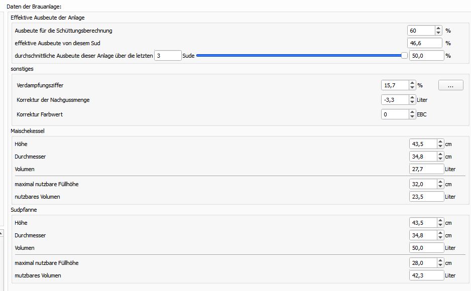 Anbei zur Hilfe & gerne Korrekturhinweise unsere 'Ausrüstungs'-Werte im kl. Brauhelfer (Version 1.4.2.2 - update steht an).