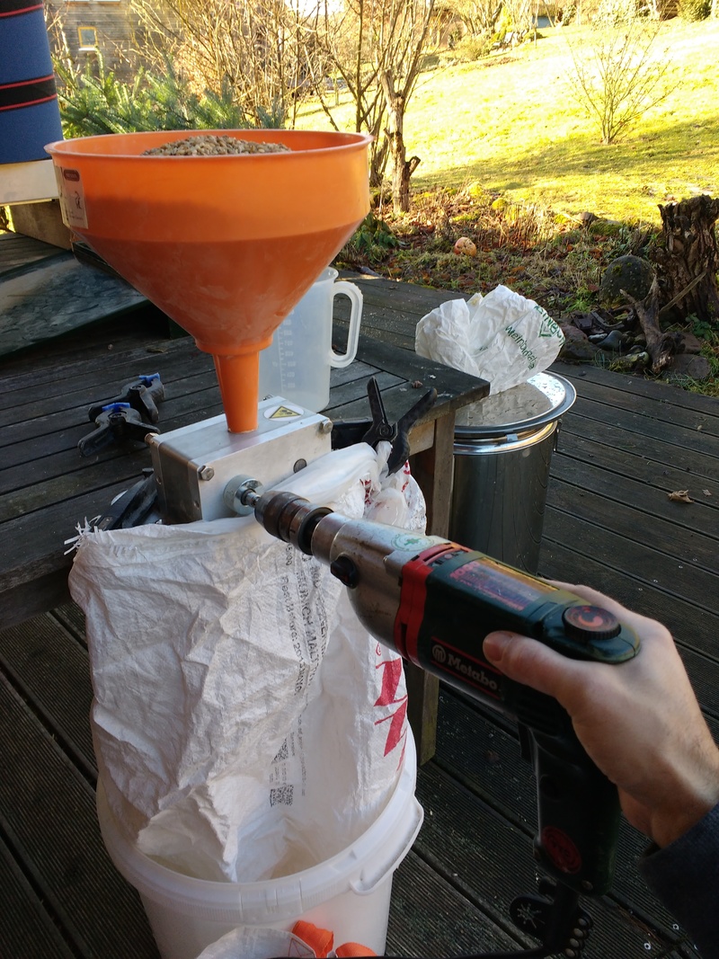 Und während 27l Hauptguss im Topf auf der Hendi der Einmaischtemperatur entgegensahen, sollte geschrotet werden:
