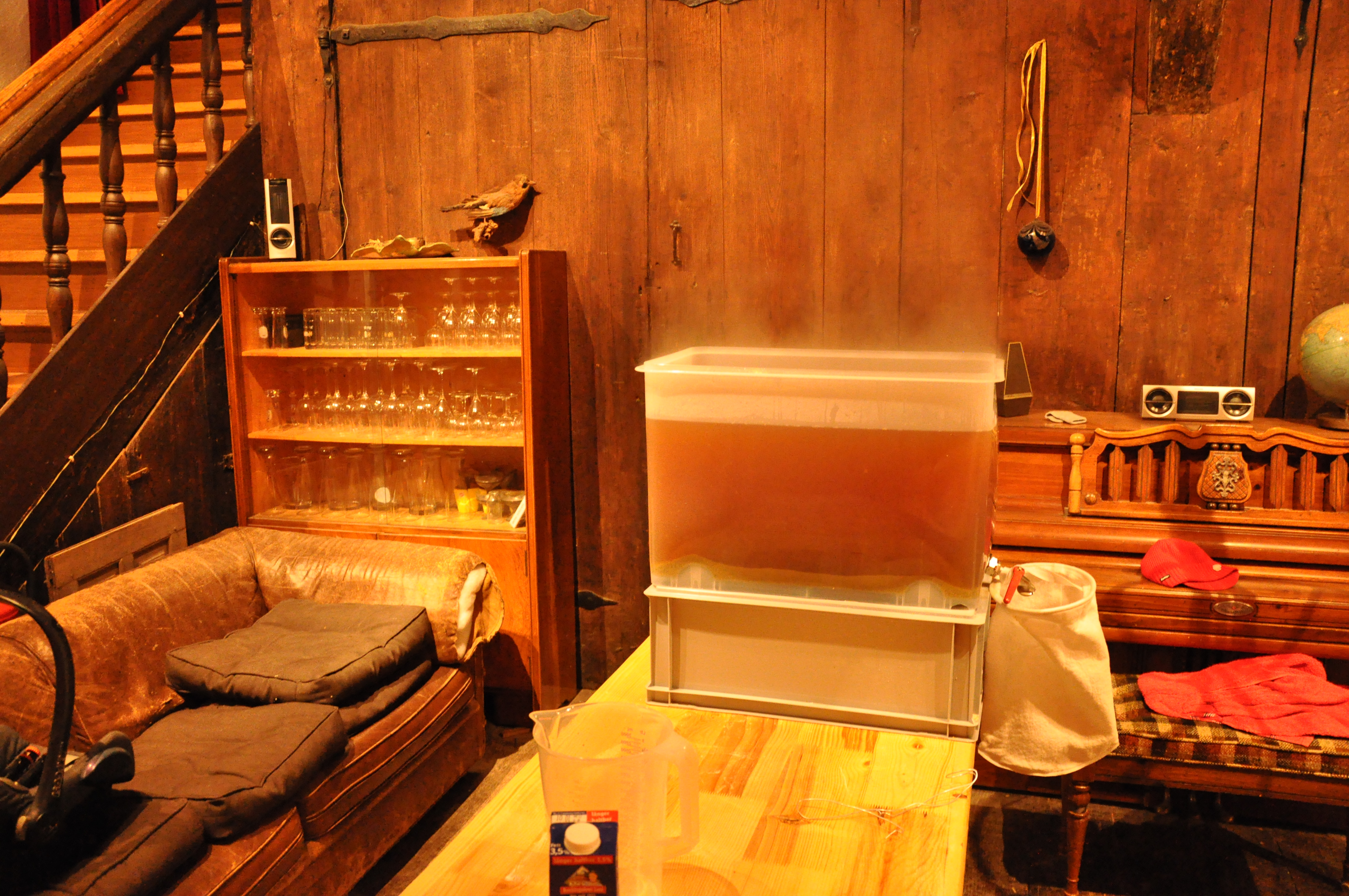 Am Ende des Kochens, der Topf war nicht mehr ganz so voll: Das Hopfenseihen geschieht wieder über den Läuterbottich: Ich habe 11 L Würze heiß abgefüllt, teilweise als Speise, teilweise für die nächsten Hefestarter. Da die Gardena-Anschlüsse der Kühlspirale nicht 100%ig dicht sind, musste ich den kleinen Topf als Tropfgefäß nebendran stellen. Falls jemand eine gute dauerhafte Lösung für dieses Dichtigkeitsproblem kennt, wäre ich dankbar. Anstellen und gut ist: Die Umgebungstemperatur des Gärbottichs beträgt aktuell 18°C (die Heizung im Bild ist aus). Trotz ordentlichem Steigraum im Bottich drückt es aktuell etwas Kräusen oben raus. Heute versuche ich, die Temperatur noch etwas niedriger einzustellen. Durch Herumtragen des Thermometers kann ich derzeit fast jede Temperatur irgendwo im Haus finden... das Umtragen des Biers macht leider wenig Spaß.