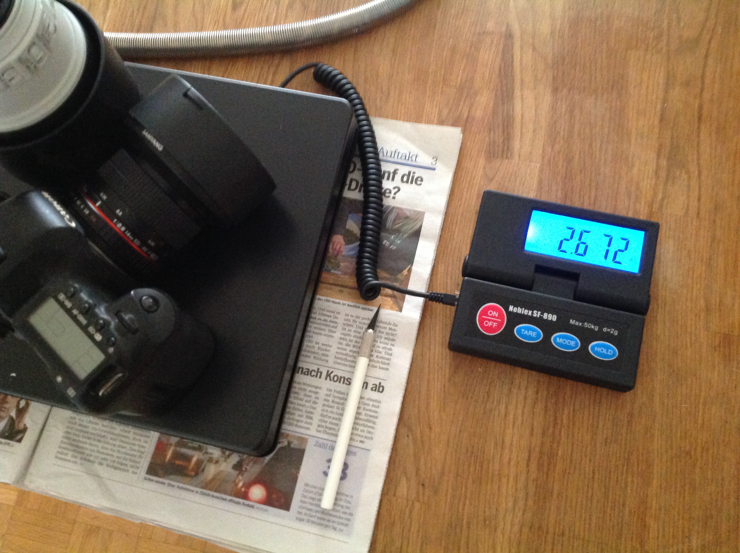 Als Feinwaage verwende ich eine tomopol Waage 500/0,05 g, deren Genauigkeit ich mit einer kalibrierten Laborfeinwaage gegengemessen habe.
