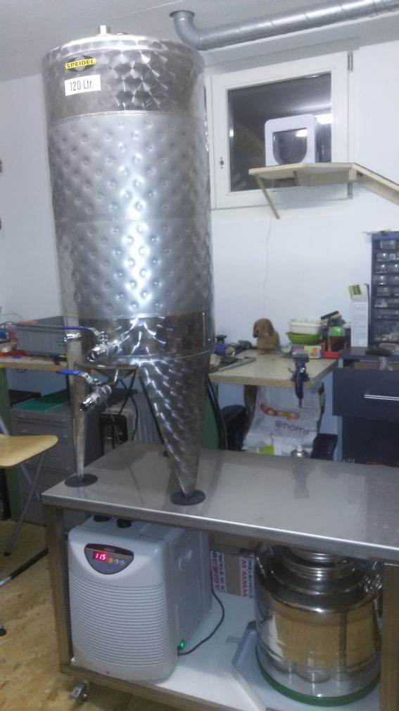 Der Speidel 120 Gärtank mit Doppelwand und Kühlkreislauf soll via Heilea HC-300 Aquariumkühler für UG und OG Biere gekühlt werden können.