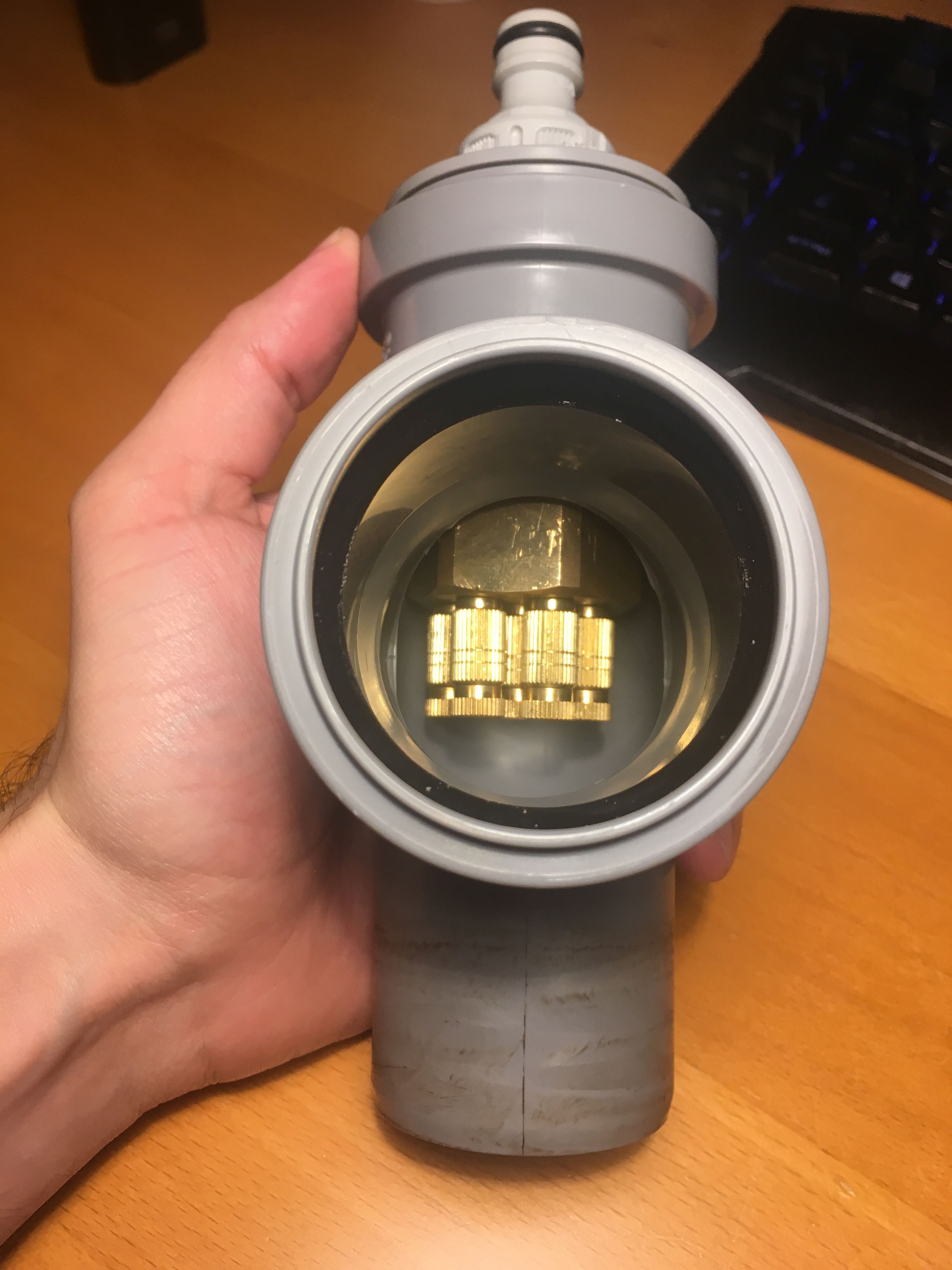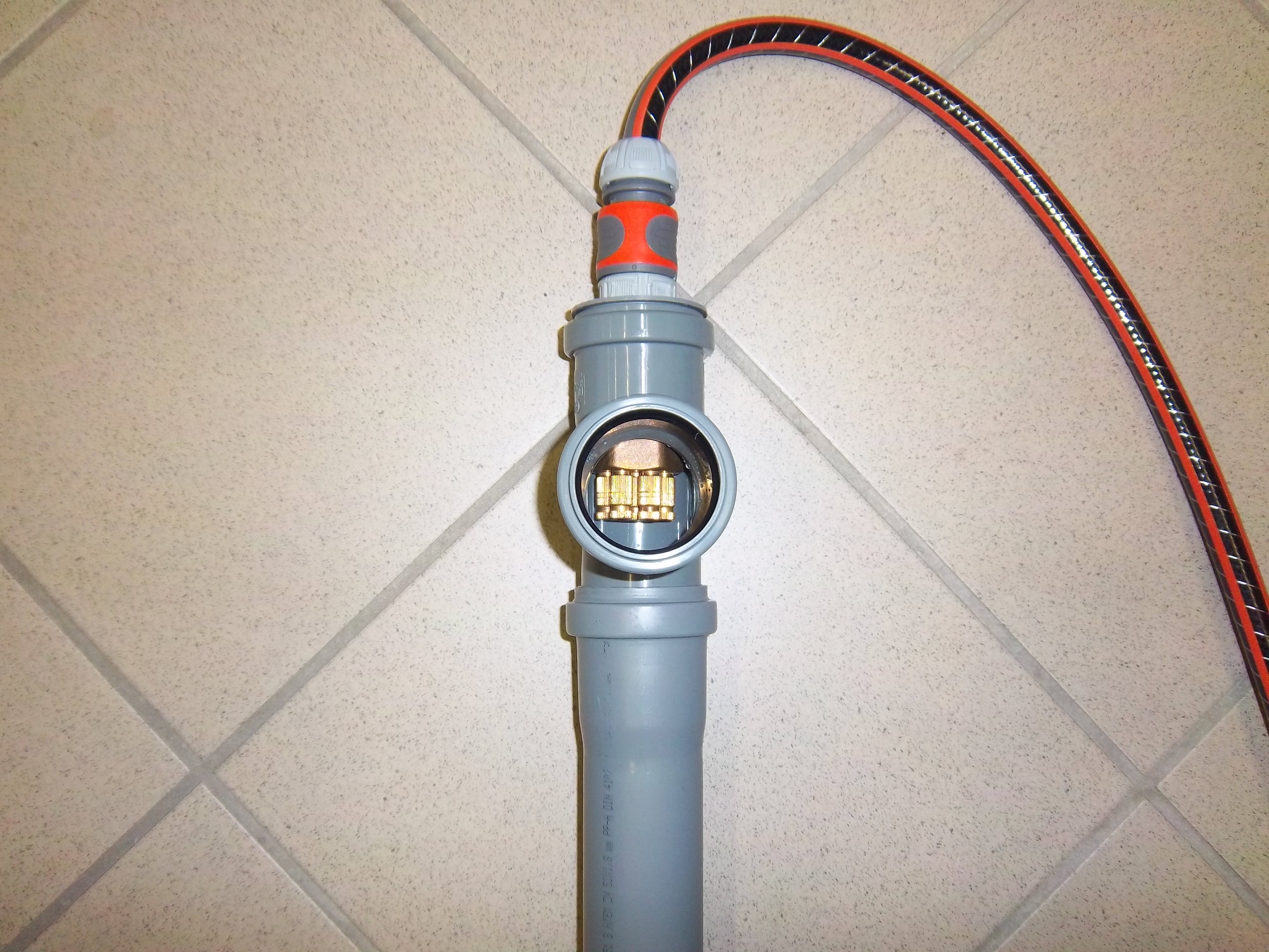 Aber auch die Austropftemperatur von 50-60° (je nach Wassermenge in Topf) gefielen mir nicht. Denn auch bei dieser Temperatur entsteht noch Dunst. Ich habe dann mit größeren Rohren (70er,100er) oder längeren Rohren experimentiert, es half alles nicht. Die Austropftemperatur wird ausschließlich über die Menge und Temperatur des Kondensatwassers bestimmt. An meinem Düsenkopf wollte ich nichts mehr verändern, aber eine 2.Düse (durch die Experimente schon vorhanden) am unteren Ende der Kondensators löste das Problem. Die Austropftemperatur liegt jetzt bei 30-35° und im Sommer dann bei ca. 38-43° - da dunstet dann nichts mehr. Der Wasserverbrauch ist jetzt ca. 70 Liter/Stunde.