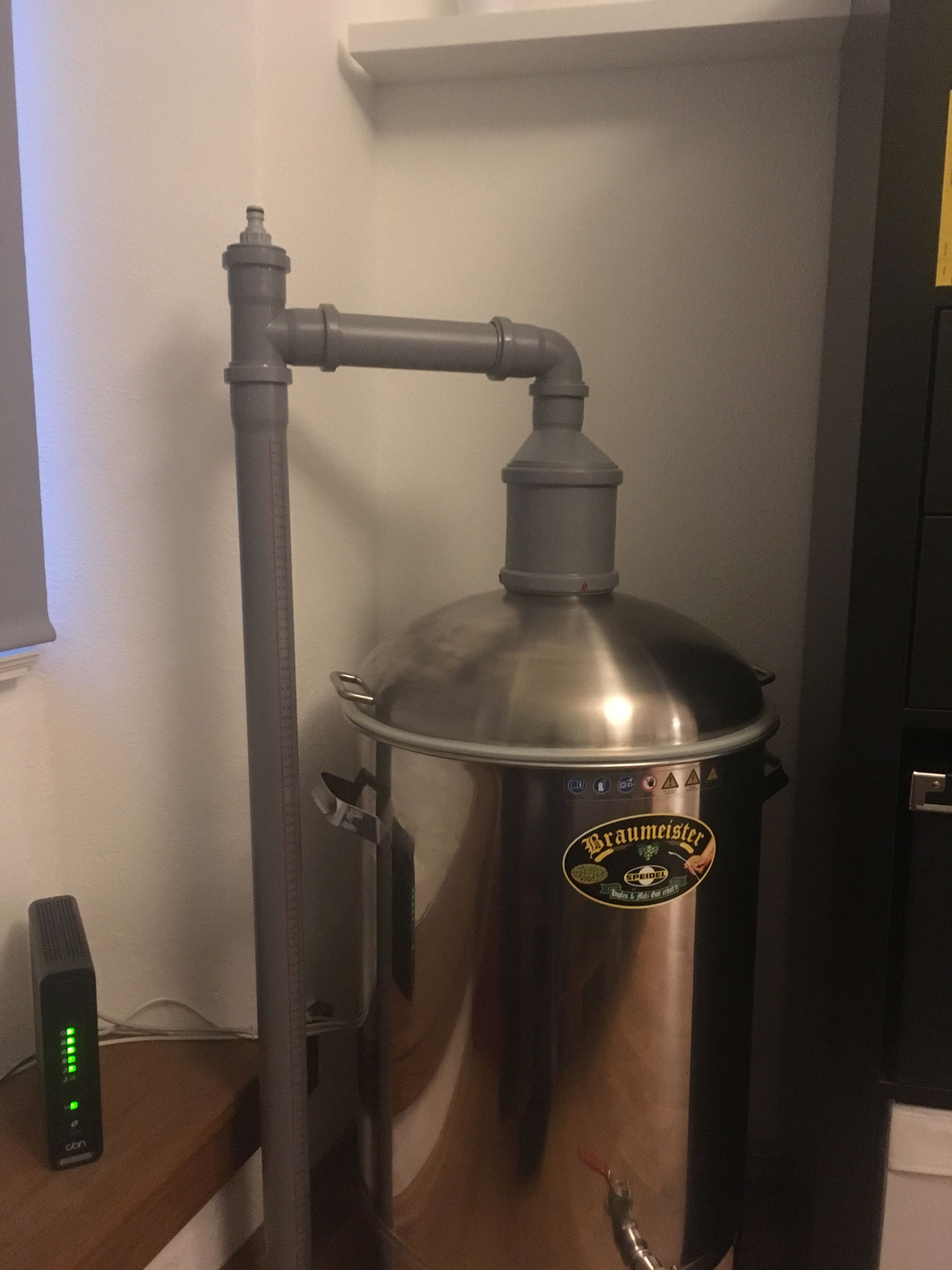 Die Anordnung insgesamt habe ich nochmal leicht verändert, dadurch rutscht das ganze Kondensator-Rohr nach oben. Der Topf mit Hendi und Kondensator würde auch in meiner Küche in die Spüle tropfen können.