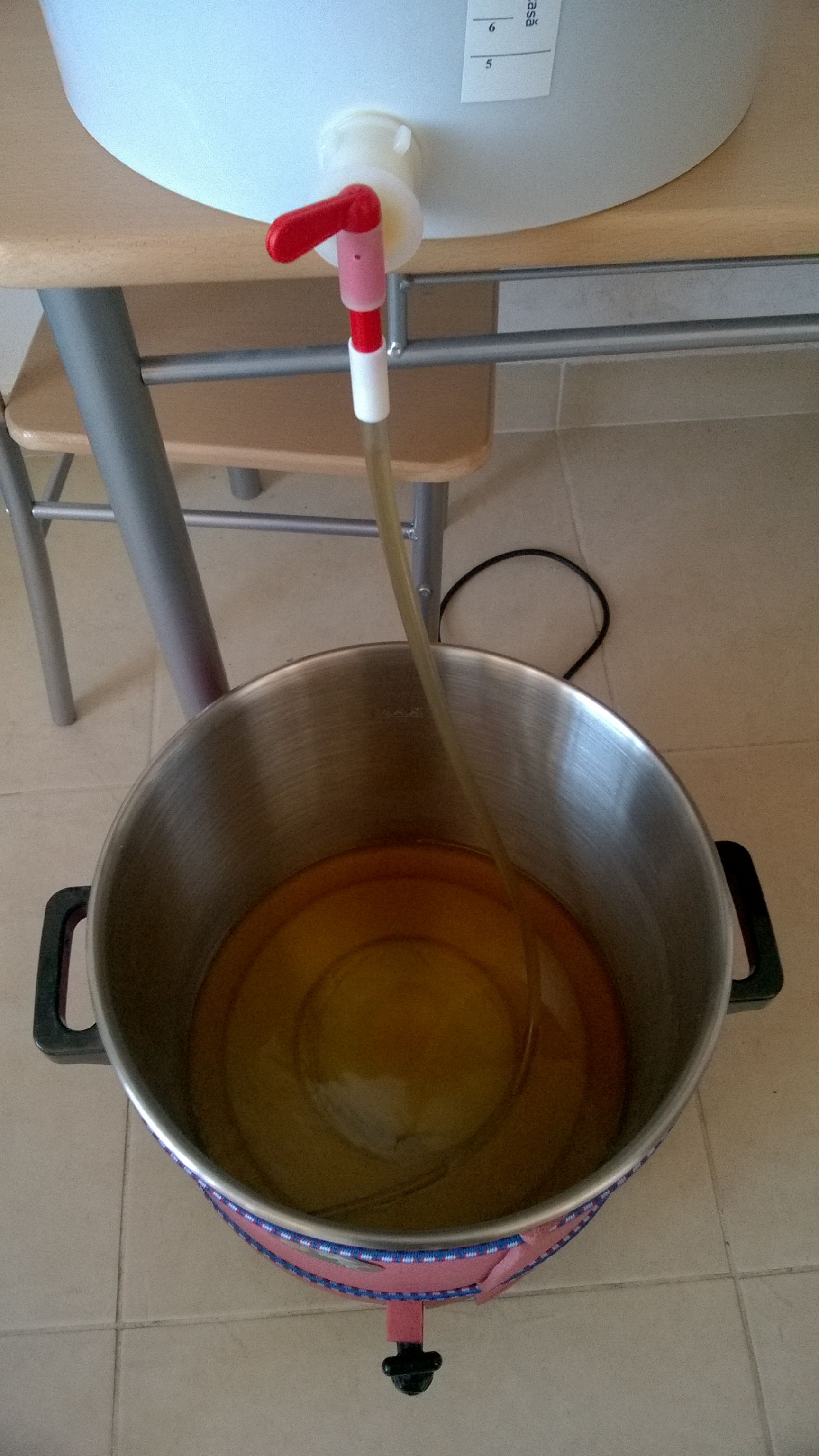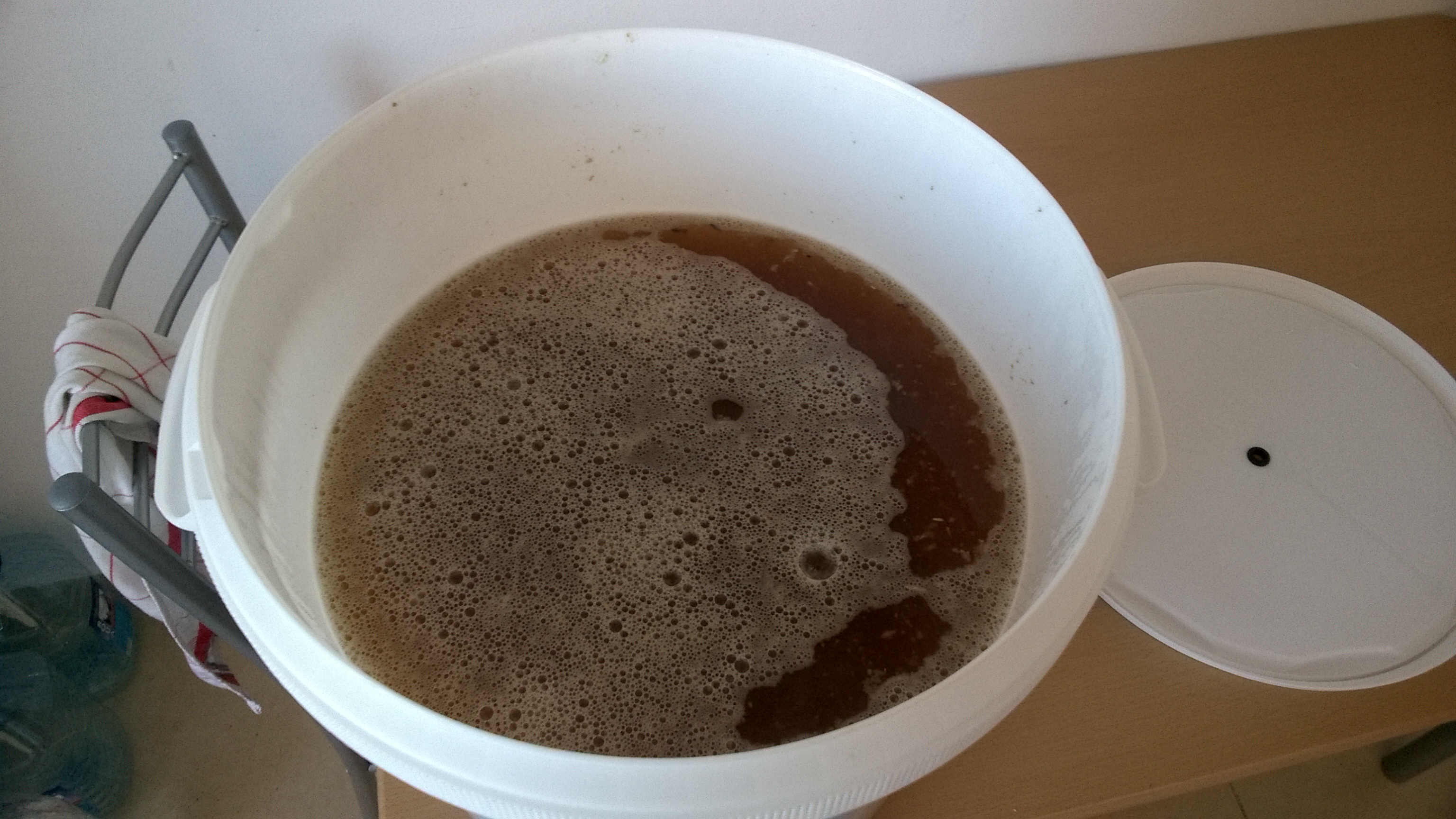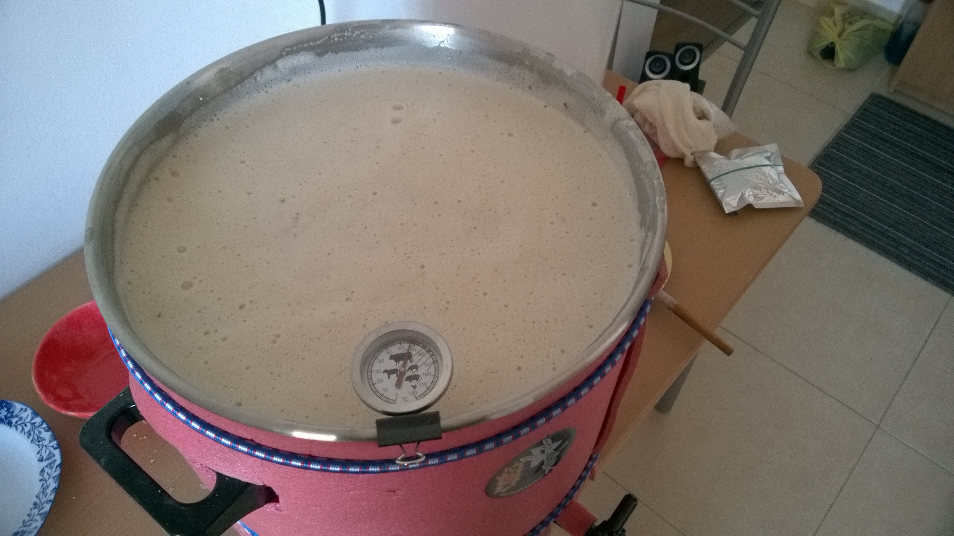 Hier mal die Gerätschaften - eine uralte und vergessene Isomatte dürfte dabei helfen. sie hatte ihren Dienst beim trekking schon erfüllt Eingemaischt habe ich ein bisschen zu hoch bei 70 und es ergaben sich dann 67 °C, ein bisschen über die im Rezept vorgesehenen 65 aber die haben dann um die 20 min. gehalten bis die Temperatur dann richtig war und die wurde dann auch noch etwa 40 min bis zum Jodnormal gehalten. Die Biggie-Isomatte Kombo hat ne gute Figur gemacht und ich musste nur einmal kurz nachheizen. Nach der 20 min Läuterrast gings dann ans abläutern und die Würze war nach etwa 4 Liter klar. Der Schlauch wurde nach ein paar Litern entfernt und die die Position gewechselt, dabei richtig vorsichtig die Maische bewegt um den Treber nicht zu wirbeln.Nachgüsse erfolgten bis der Kocher fast voll war, wollte nicht eine kleine Stw haben. Der Biggie hatte beim kochen auch eine gute Figur gemacht und mit ein wenig Hilfe vom Deckel ging das wallend Kochen richtig gut, hier eine kurzes Video davon. Gekocht wurde 60 min.