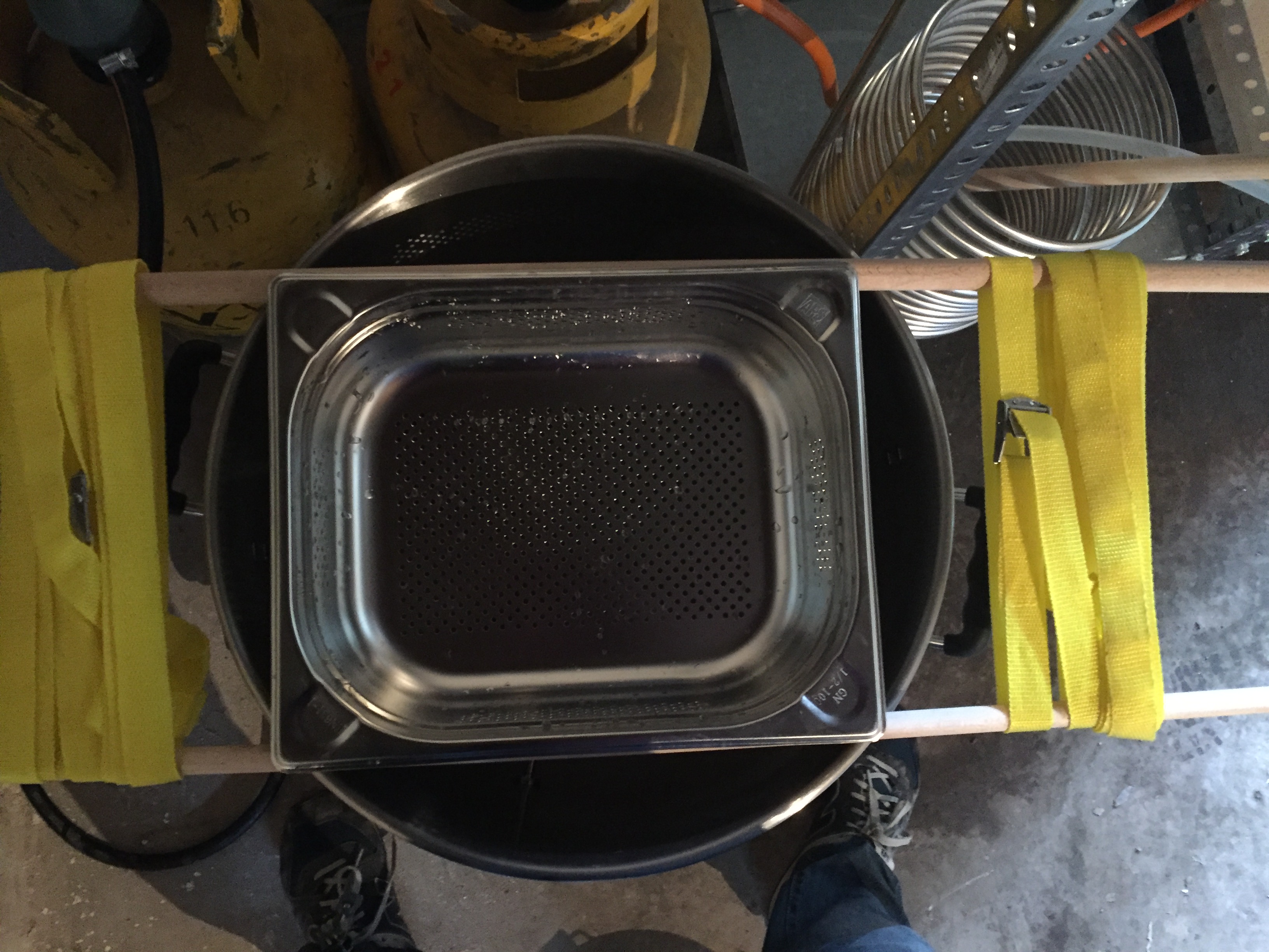 Der GN-Behälter zum Läutern passt nicht ganz auf den Kessel, und bekam deshalb eine Trage aus zwei Rundhölzern und Transportgurten verpasst.