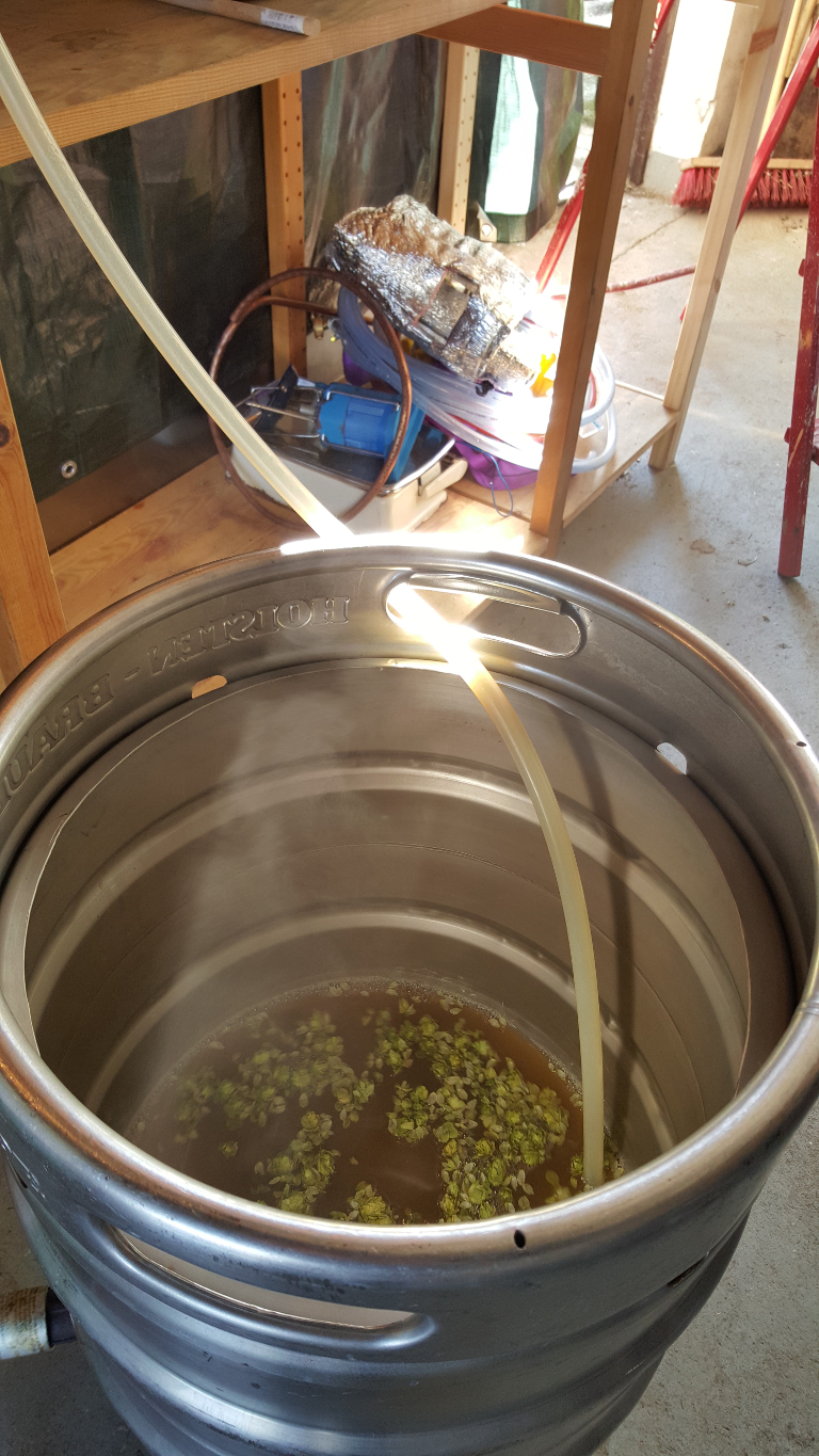 Man kann sehen, dass an diesem Brautag mit Pellets gearbeitet wurde. Da klappt das mit dem Wirlpool eigentlich immer ganz gut. Zumal das Fass unten auch konisch zuläuft. Beim ersten Mal mit Doldenhopfen hingegen war das Ausschlagen eine Katastrophe. Die Dolden haben sich immer wieder im Schwanenhals verklemmt. Ich musste so viel rumfummeln, dass ich mir am Ende doch noch eine Infektion gefangen hatte. Diesmal habe ich einen Topfreininger in den Schwanenhals gesteckt. Das hat super funktioniert, auch wenn noch nicht der Weisheit letzter Schluss. Die Kühlleistung der Kühlspirale ist in jedem Fall wirklich enorm gut.