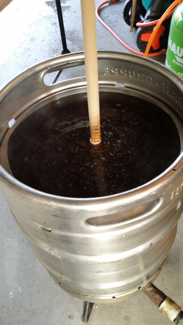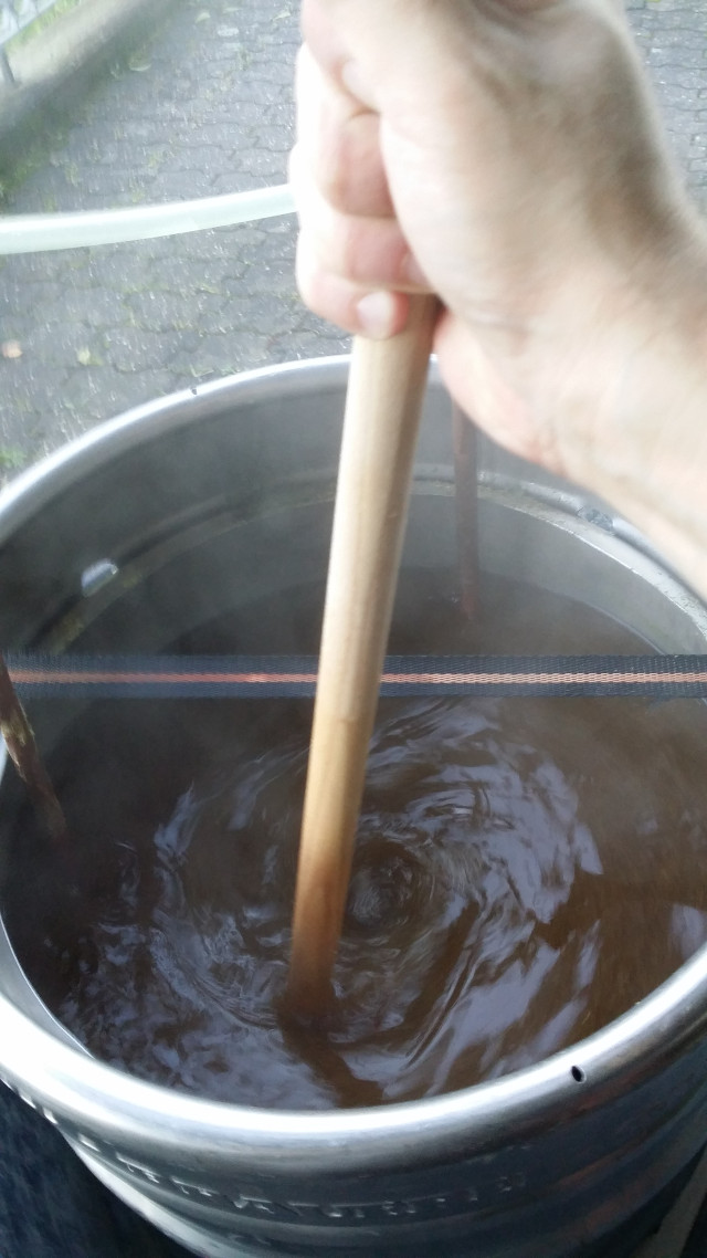 Beim Einmaischen kommen dann Neuerung 2, 3 und 4 ins Spiel: Mein Proficook (rundes Q-Siegel, ohne Macke beim Aufheizen bis jetzt) und mein Rührwerk und Leuterator mit Hahn von Adams Hardware. Das erleichtert die Maischearbeit wirklich erheblich! Außerdem ist Läutern ohne Umschöpfen echt eine bequeme Sache. Uns sieht außerdem auch noch klasse aus!