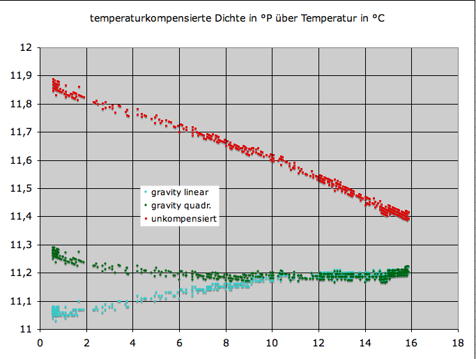 Der ist nicht besonders groß, macht aber zwischen 10° und 20° umgerechnet bis zu 0,7°P aus. Leider ist es von Spindel zu Spindel unterschiedlich, noch nicht einmal das Vorzeichen ist gleich. Es kommt bei mir alles zwischen -0,07°P/°C und +0.03°P/°C heraus.