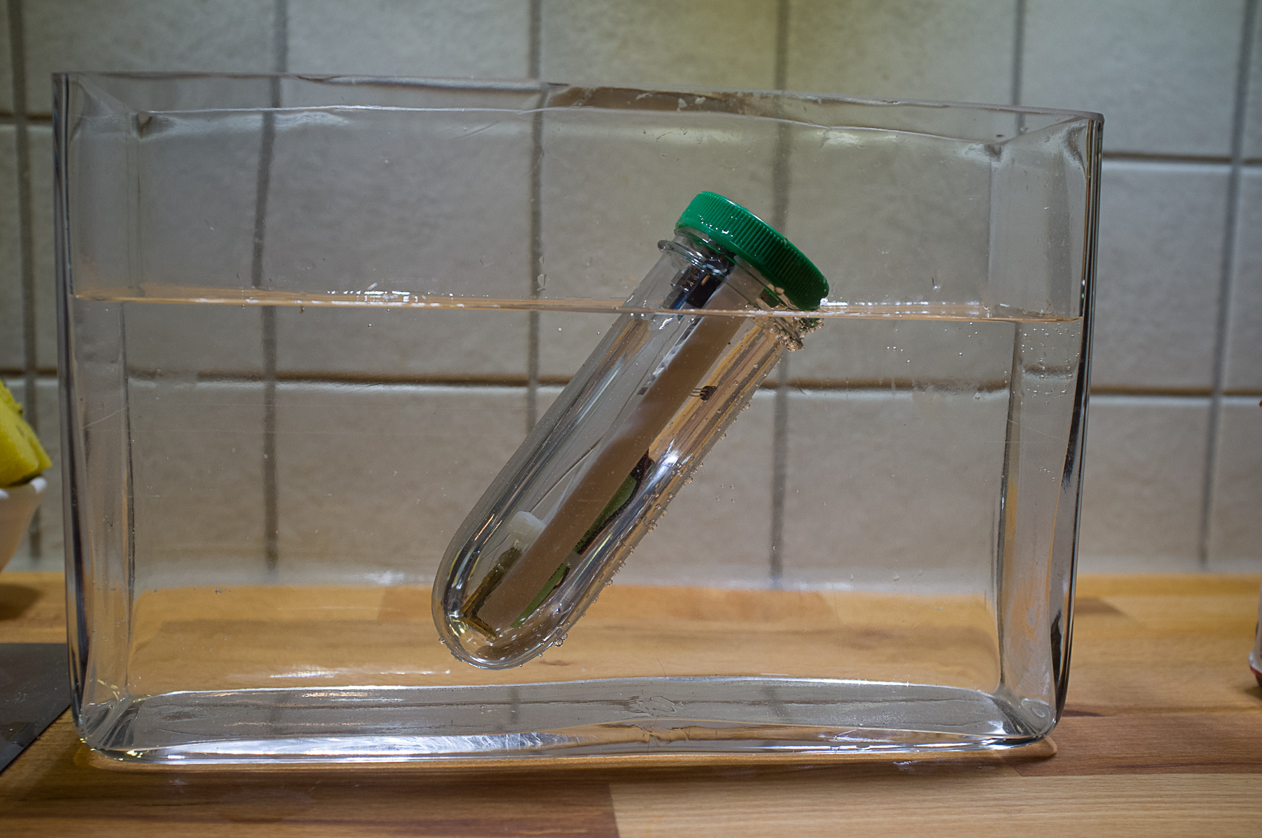 1. Spindel in Wasser (oder besser Zuckerwasser mittlerer Dichte schwimmen lassen). Bei Raumtemperatur Dichte rho1 und Temperatur T1 aufschreiben.
