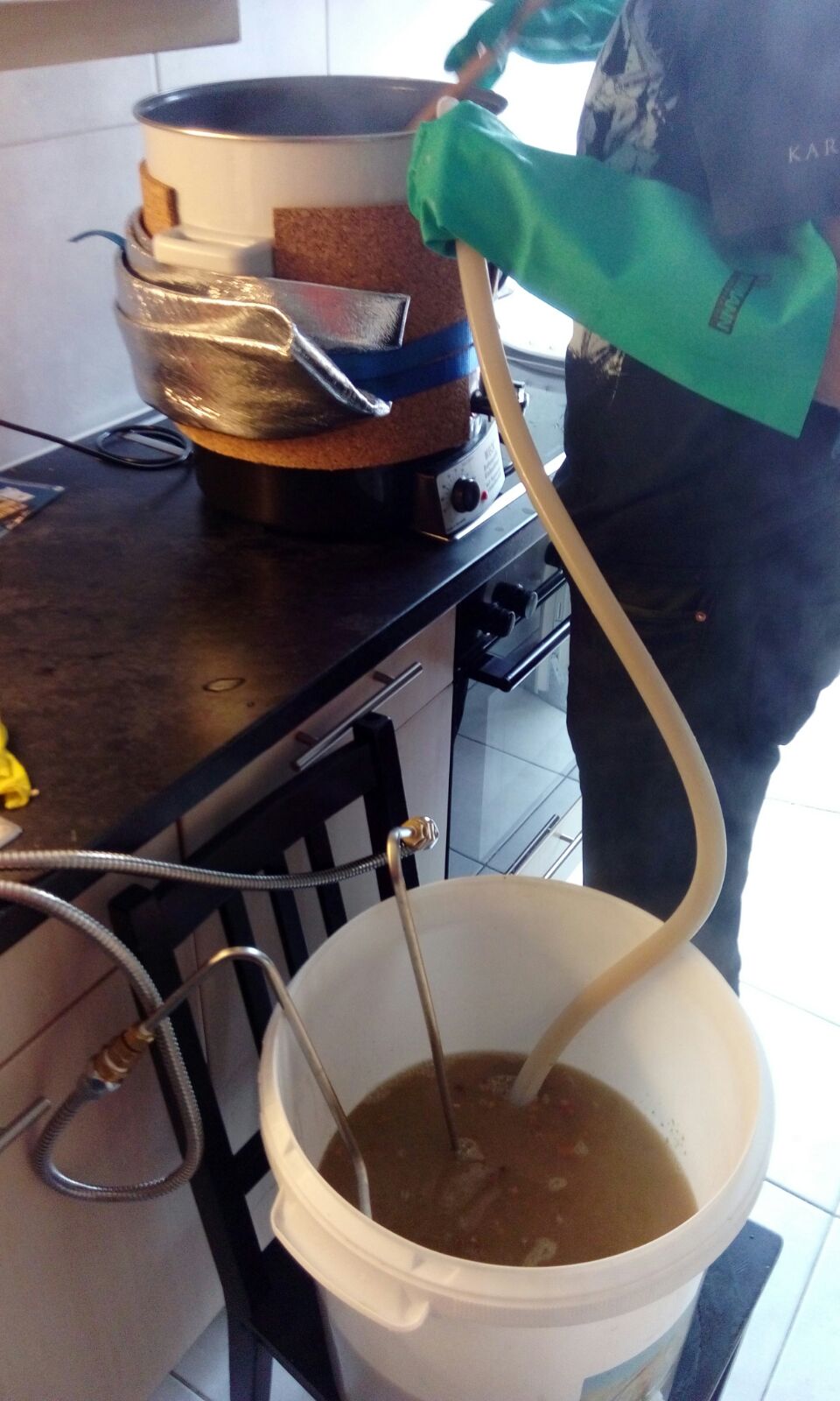 - Vor dem Abfüllen in den Läuterbottich zur Kühlung. Premiere war das Anspringen des Überhitzungsschutzes, deshalb musste beim Einkocher kurzhand das Röckchen hochgekrempelt werden, dann gings wieder. Im Läuterbottich (ja bis 100° hitzebeständig) wurde gekühlt und der Whirlpool angesetzt. Das Kühlwasser wurde dann gleich auch für den nächsten Sud verwendet.