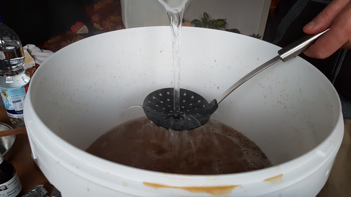 Hopfensäckchen versenkt (hab es am nächsten Tag noch beschwert, weil es oben schwamm) und Hefe dazu gegeben. Beim nächsten Mal werde ich den Hopfen erst nach der ersten Gärwoche dazu geben und die Hefe rehydrieren, da die Gärung doch sehr schleppend anlief. Das sind dann die Erfahrungswerte, die man so macht...