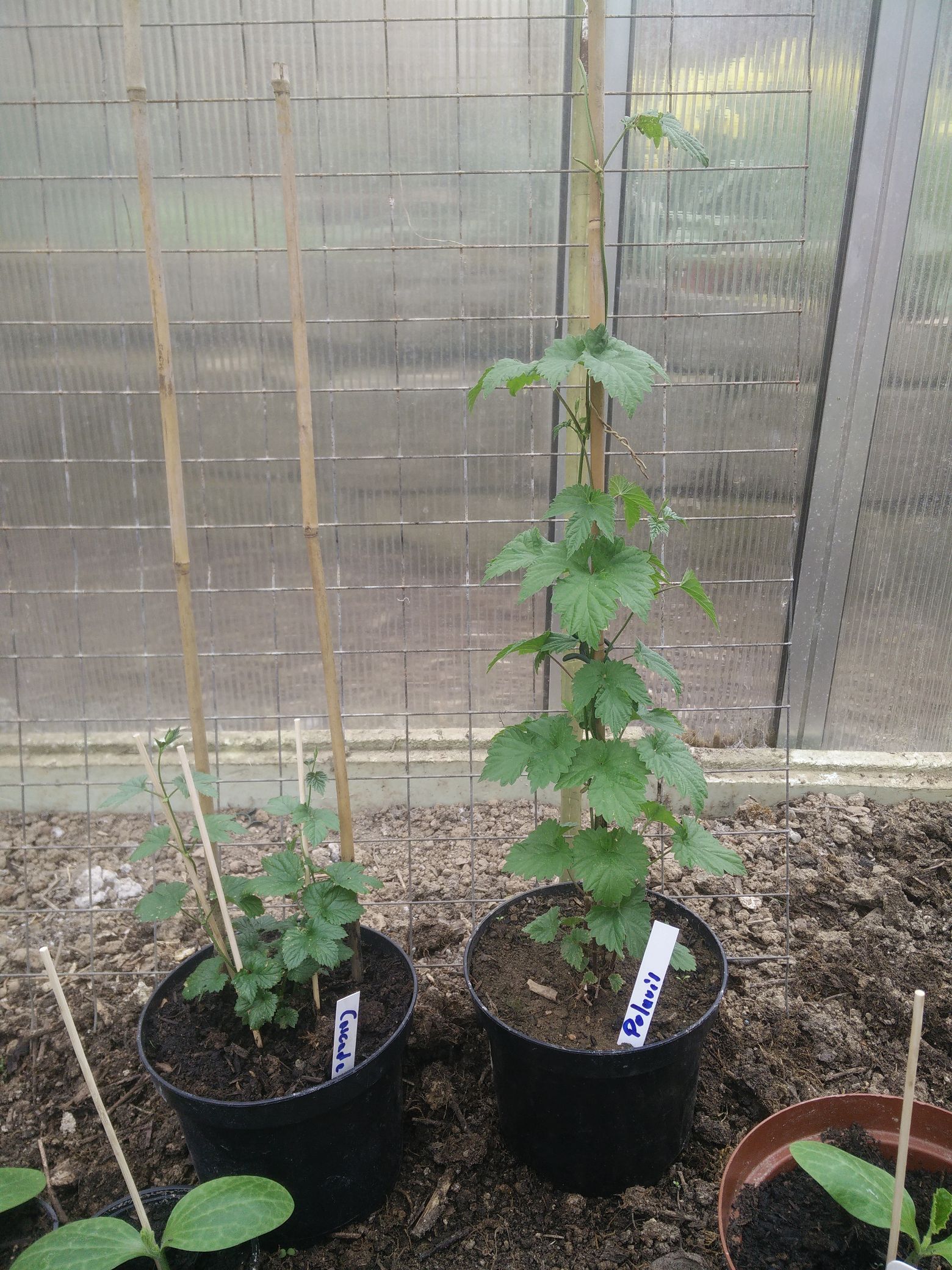 1x Merkur, 1x Comet (USA), 1x Fuggles, 1x Nugget, 1x Tettnanger, 4x Hersbrucker Pure, 1x Aroma von Eickelmann, welche Sorte das ist weiß ich nicht, 2x Target, 2x Opal, alle im zweiten Jahr und im dritten Jahr, 4x den verwilderten Kulturhopfen im Brauereigarten von 1816 - "Marktheidenfelder Meerothopfen.