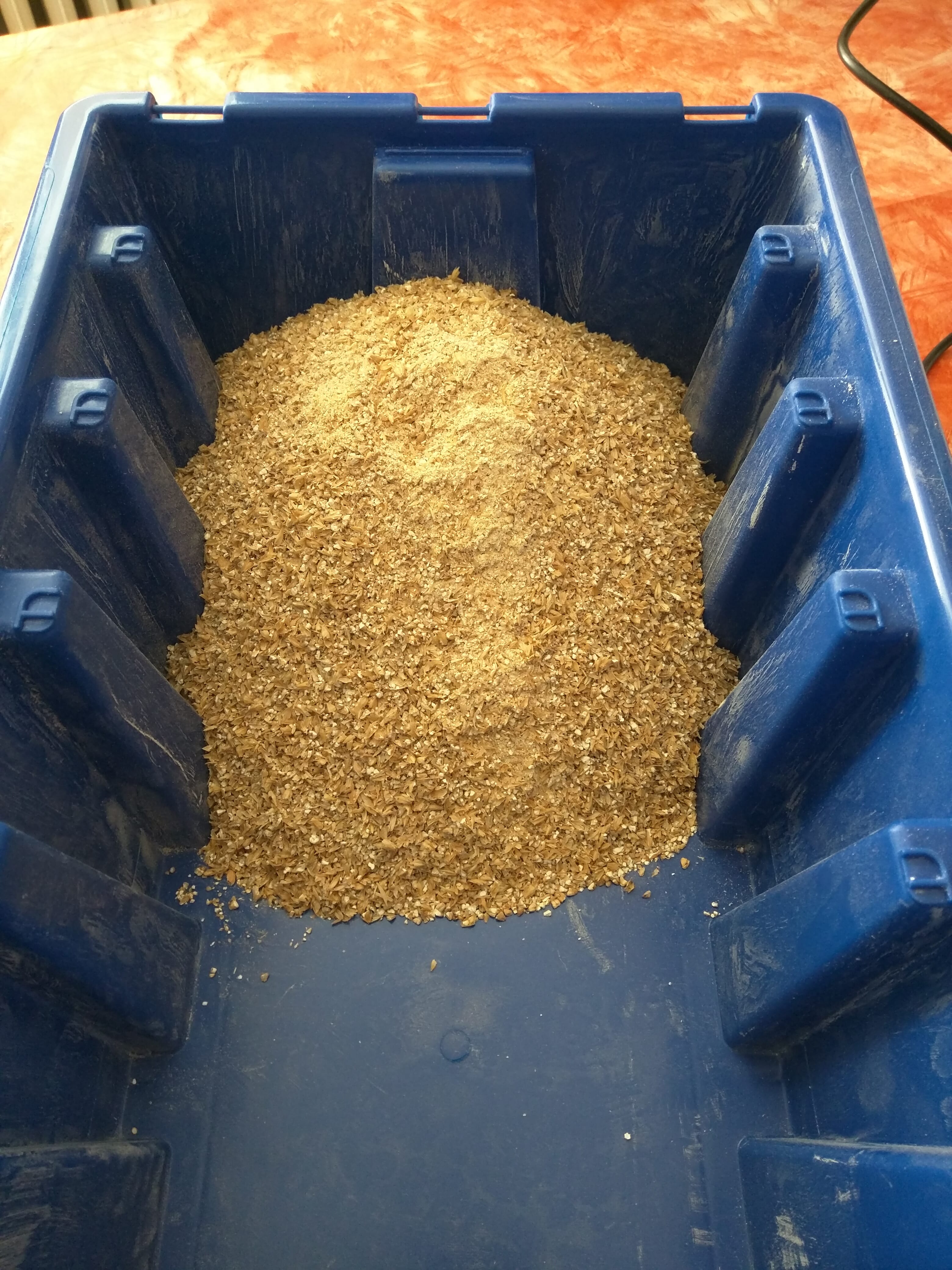 Here we go: Erstmals kam meine neue Schrot-Kiste zum Einsatz. Ich war gespannt, ob es möglich ist mit der Bohrmaschine zu Schroten. Die Röstgerste wurde durch die Zassenhaus gejagt.