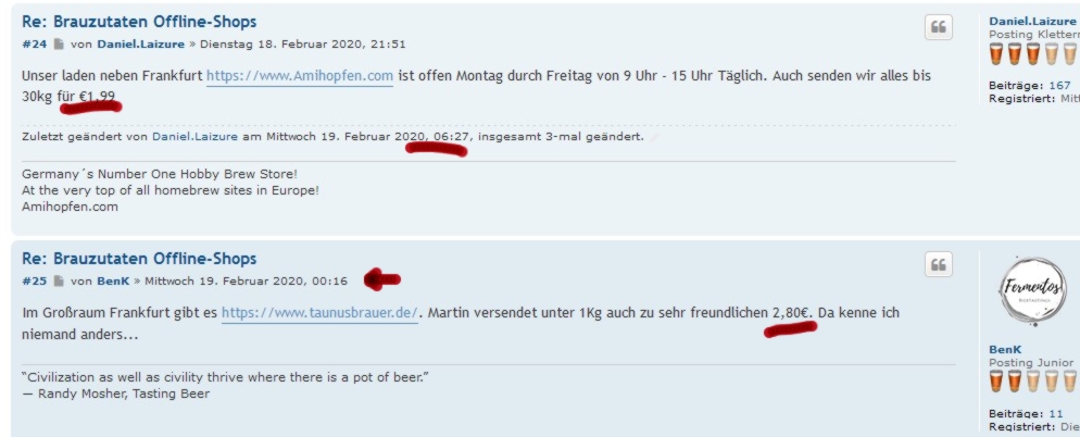 Daniel.Laizure hat geschrieben: Mittwoch 19. Februar 2020, 15:47 Es tut uns leid, dass Sie uns so sehen. Amihopfen hat den Versand seit einiger Zeit, nicht nur über Nacht, reduziert. Die Menschen hier begannen, Einzelheiten über das Geschäft, die Öffnungszeiten und den Versand mitzuteilen. Ja, ich habe das Gespräch hier aktualisiert, um zu reflektieren, worüber gesprochen wurde, und auch um mein Deutsch zu korrigieren und auch Details über die Öffnungszeiten von Amihopfen zu teilen, und da der Versand am Abend zuvor erwähnt wurde, habe ich es aktualisiert, um zu zeigen, dass Amihopfen 1,99 € kostet. Der Versand wurde in den letzten Wochen für einige Zeit von 5,99 auf 1,99 geändert. Nichts davon hat jedoch etwas mit diesem Forum zu tun. Wenn Sie in fast allen meinen Beiträgen zurückgehen, bearbeite ich sie oft, um alle meine deutschen Fehler zu korrigieren.