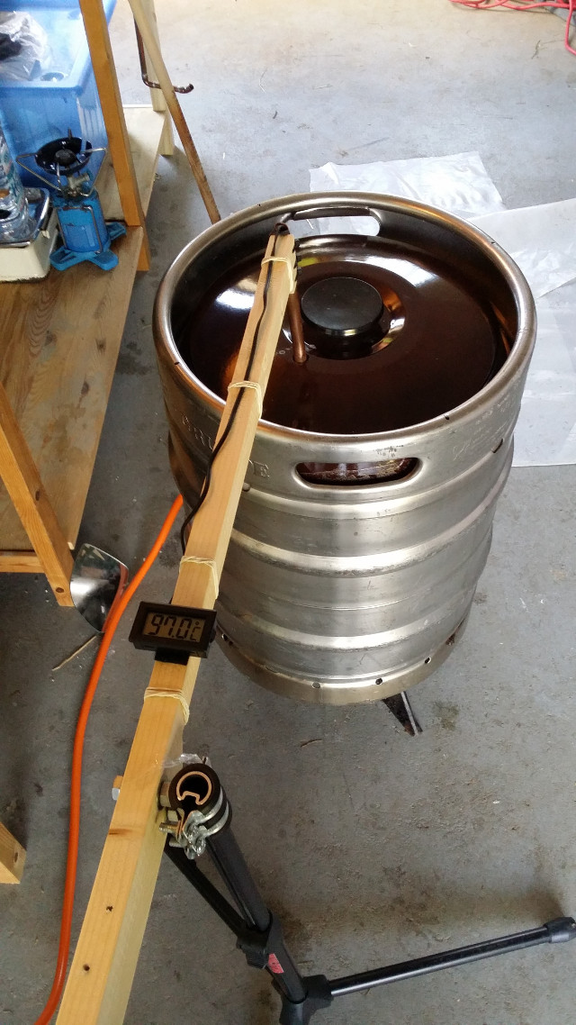 Im nächsten Bild dann Neuerung 8: Ein Brautisch, selbst gebastelt. Hier steht der Kessel zum Wirlpool auf zwei Fliesen auf dem Brautisch.