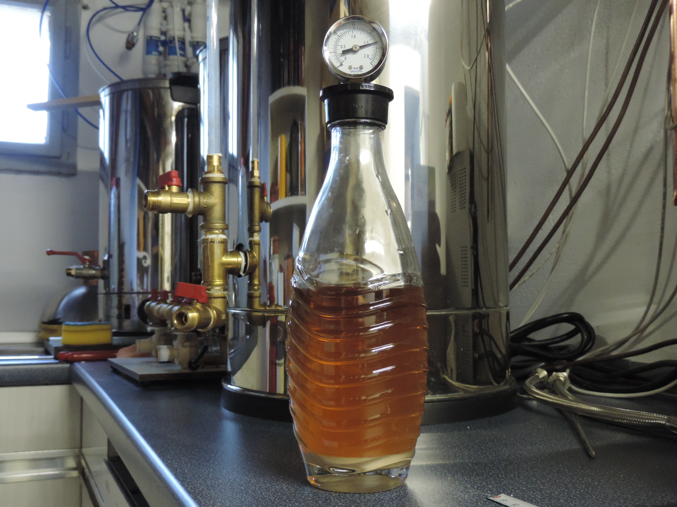 Nach einer Woche im Gäreimer bei 4,1°Plato konstant, abgefüllt in Flaschen mit Zucker.