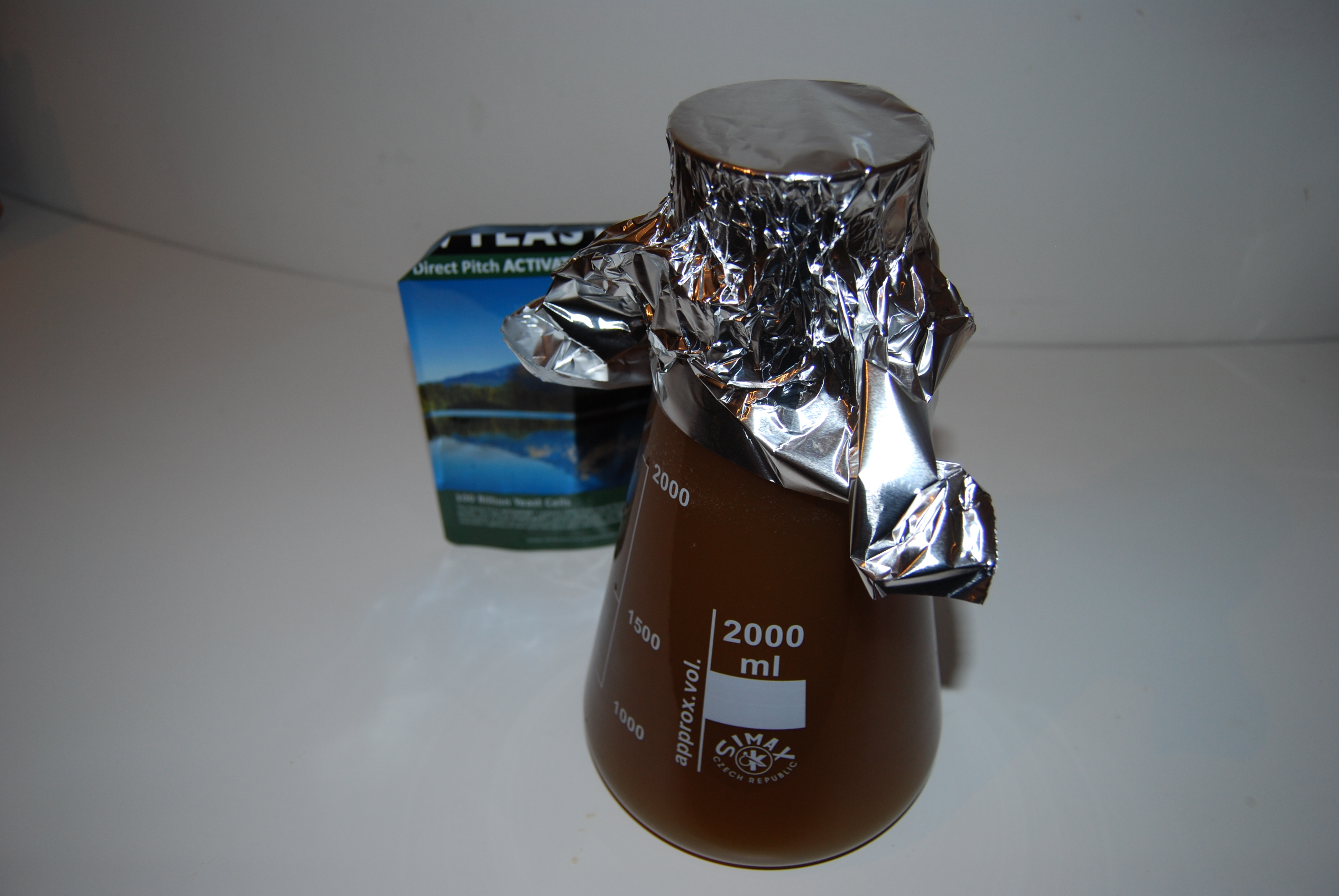 Dann habe ich 3l meiner Würze abgezwackt, abgekühlt, in ein größeres Gefäß gegeben und die Hefe beigeben. Das sollte dann am Ende die benötigten 420 Milliarden Hefezellen ergeben (sogar theoretisch nach o.g. Tabelle 450 Milliarden Zellen)