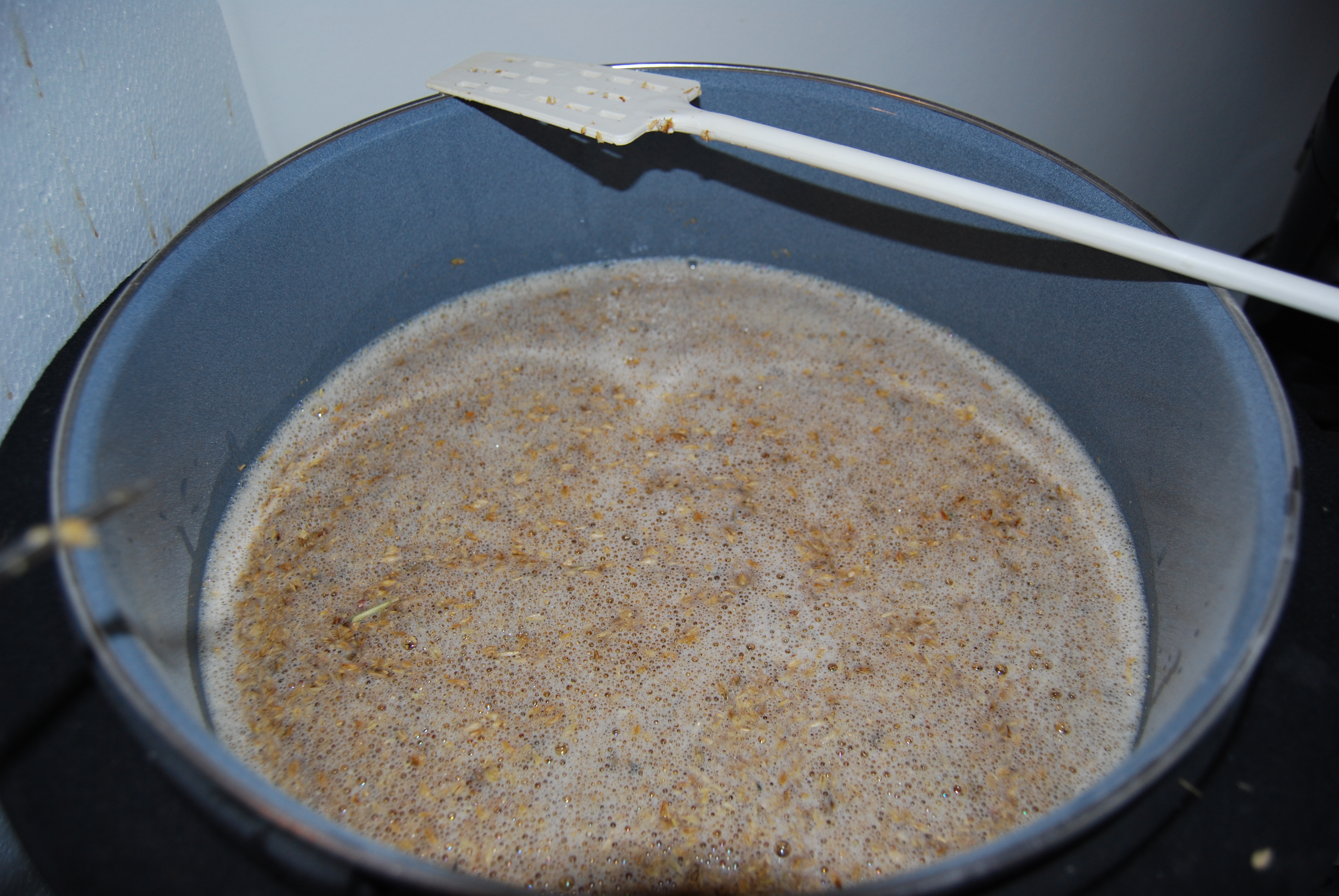 15 min absetzten lassen und dann wird die Dünnmaische von oben (etwa ein drittel des Volumens) in den Einkocher geschöpft, für 20min gekocht und wieder zurück in den Läuterbottich gekippt.