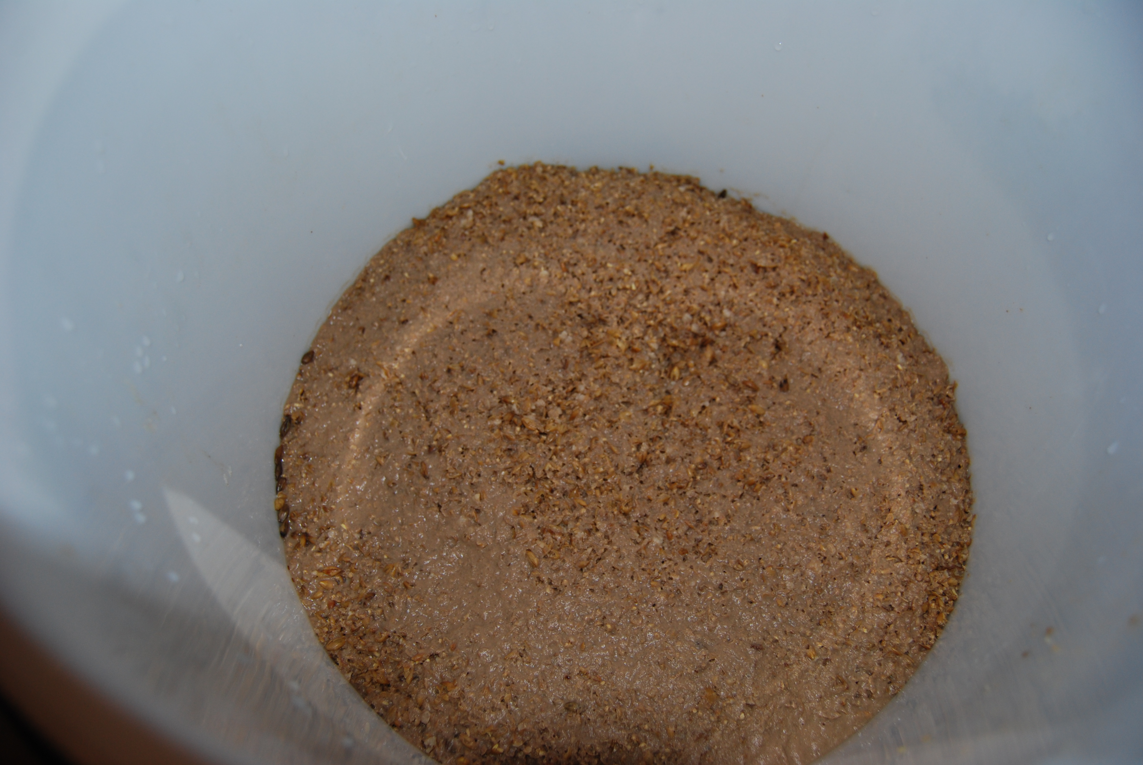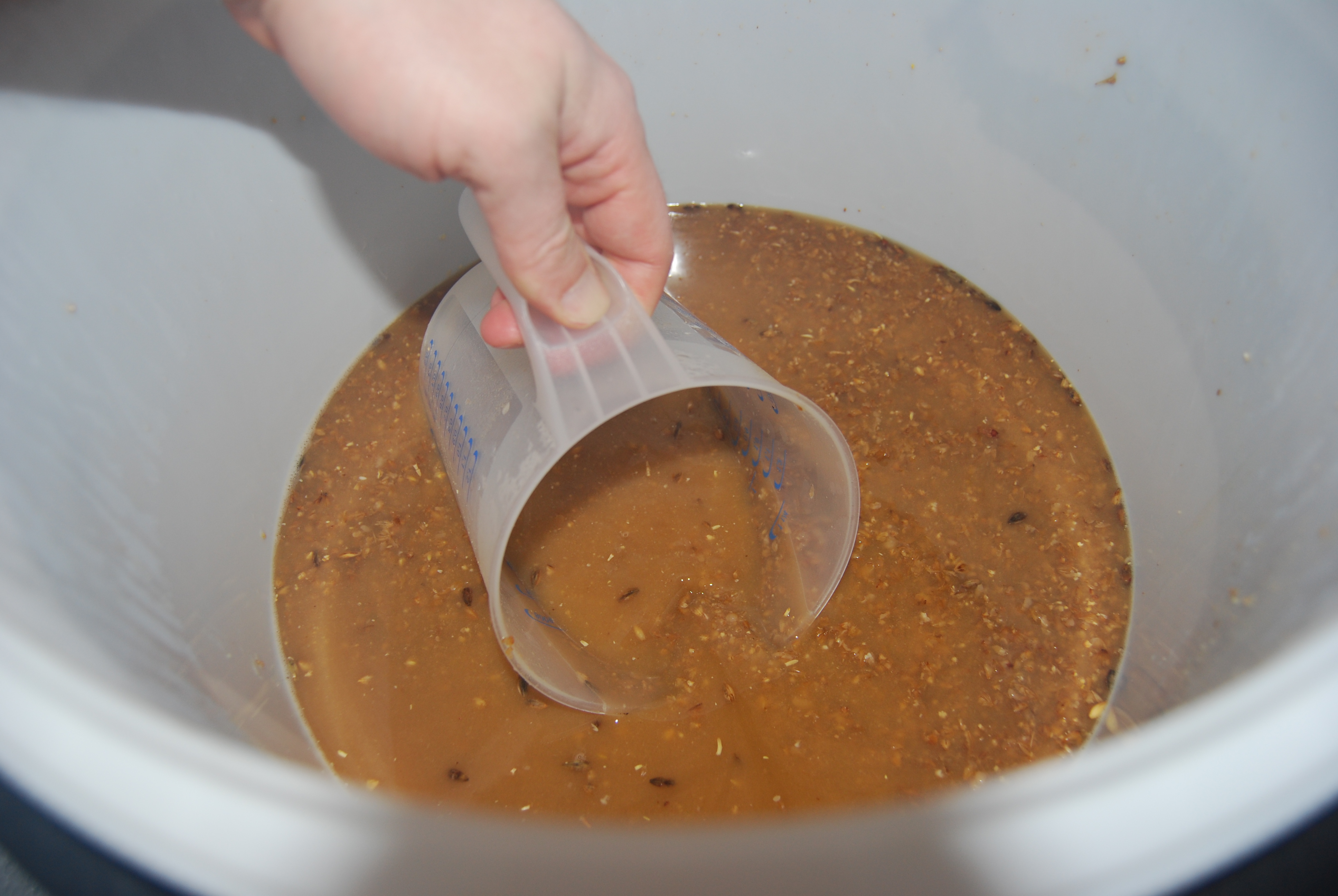 Etwas absetzen lassen und dann die Dünnmaische von oben entnehmen und rüber in den Läuterbottich schöpfen.