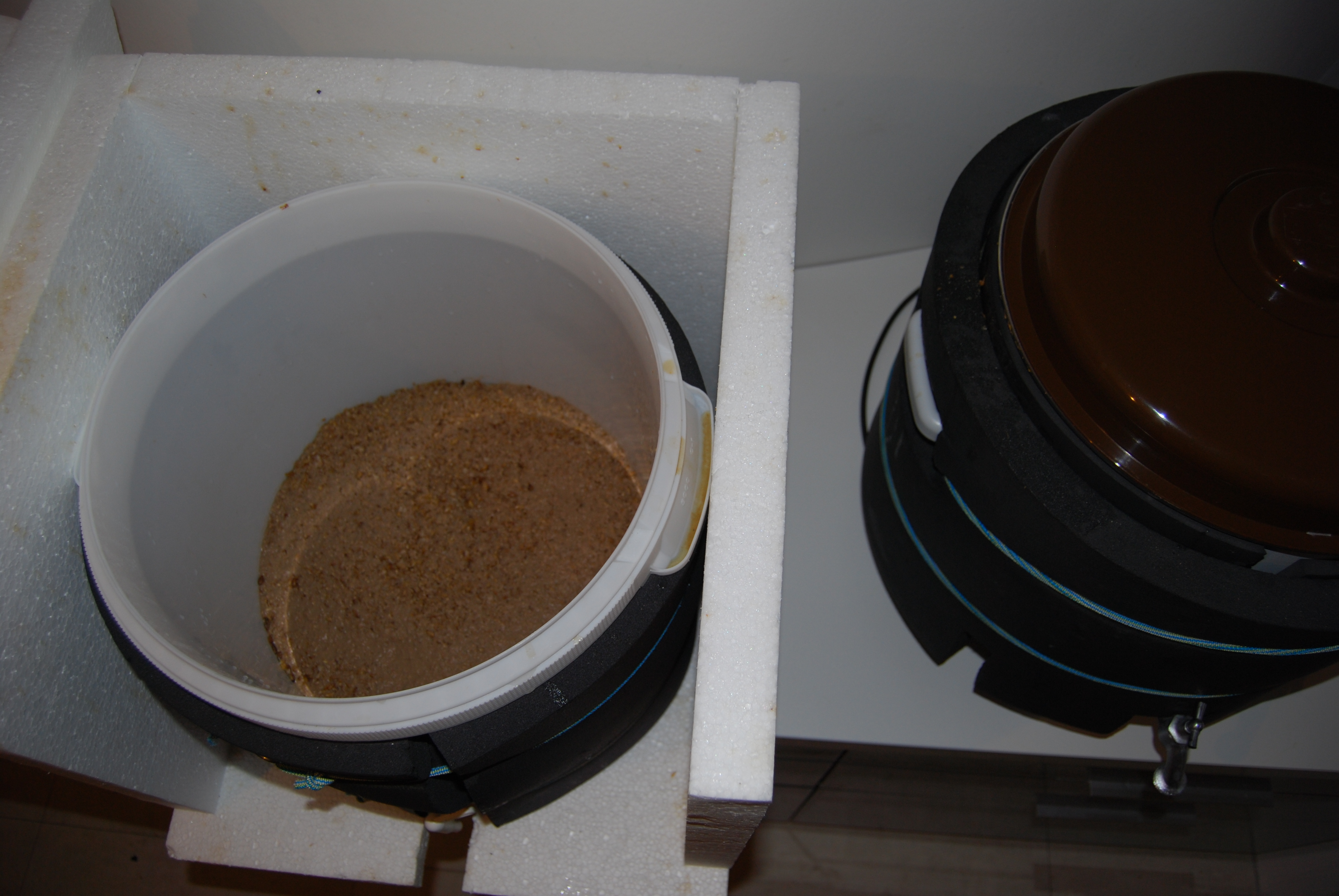 Dann begann der eigentliche Brautag. Meine Ausrüstung besteht aus einem isolierten Weck Einkocher und einem isolierten Gäreimer mit Läuterblech in einer Styroporbox.