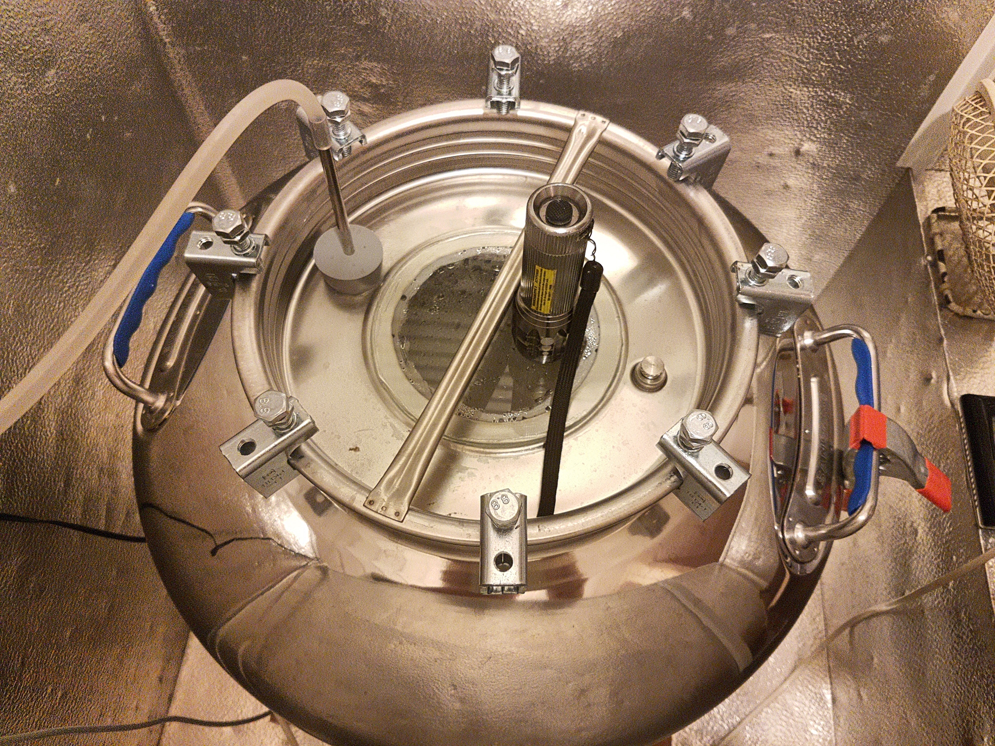 In der Mitte ist ein Sichtfenster aus Glas, mit Lebensmittelechtem Silikon abgedichtet/befestigt. Die Taschenlampe sorgt bei Bedarf für das nötige Licht. Allerdings beschlägt das Fenster teilweise gewaltig, ich überlege es mir, auf Dauer eine Doppelverglasung zu machen, was auch die Druckfestigkeit bei Überdruck verbessern sollte :Grübel Allerdings weiß ich noch nicht, wie ich das Problem mit "eingefangener" Feuchtigkeit lösen will, damit der erhaltene Dampf beim Cold Crash dann nicht zwischen den Scheiben kondensiert. :Grübel Es wäre zwar kein Drama, aber anders wäre mir schon lieber..