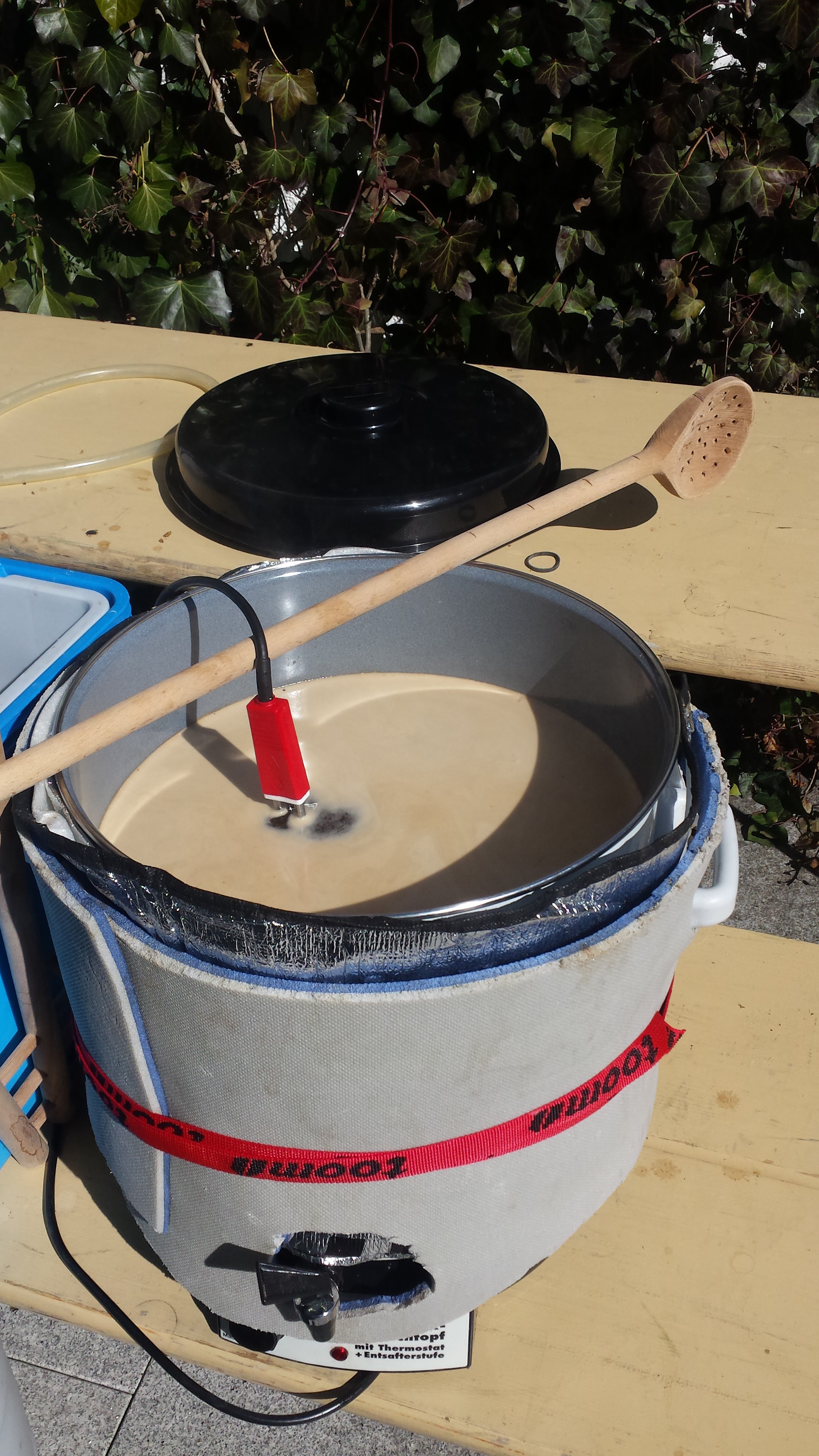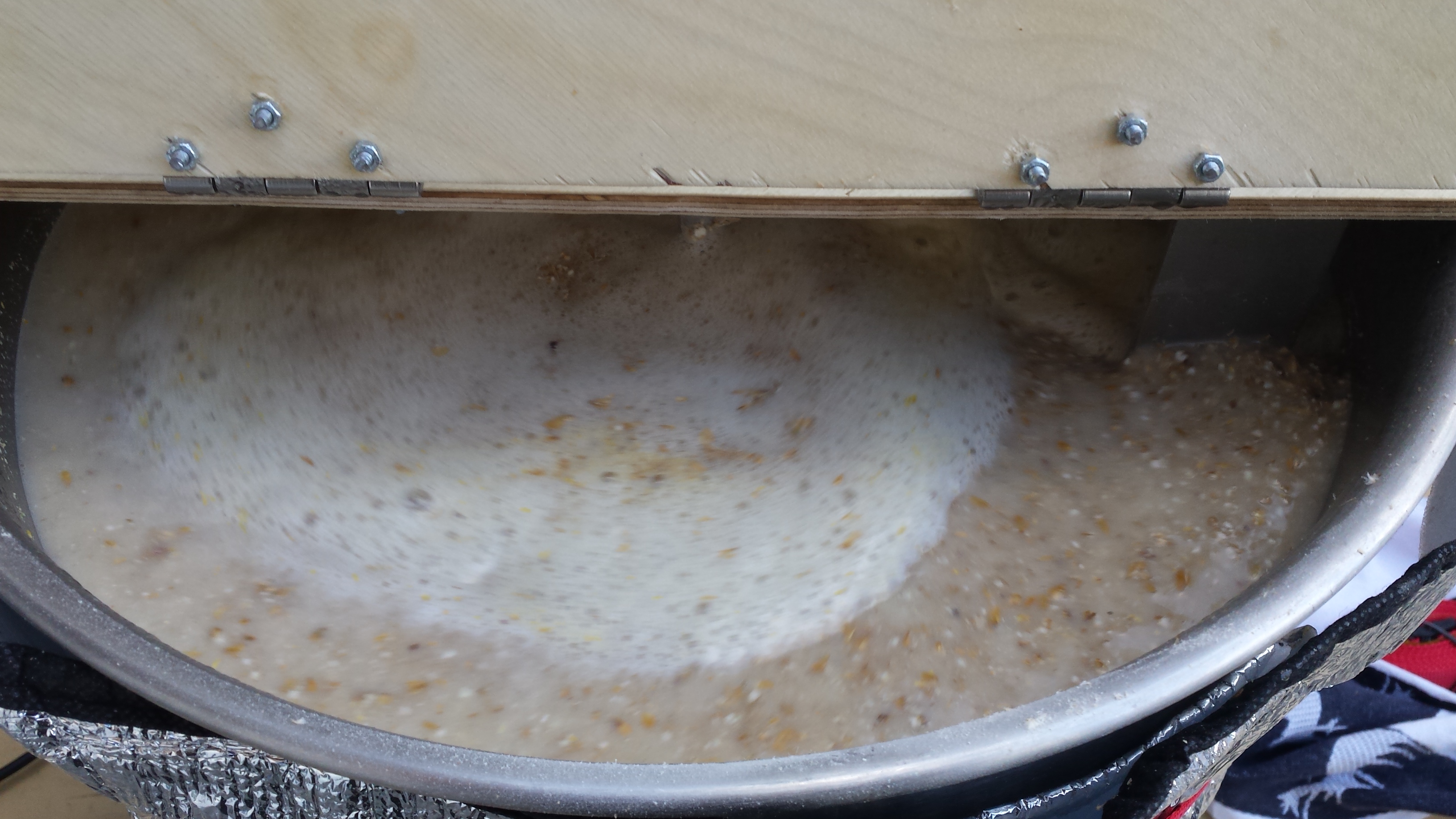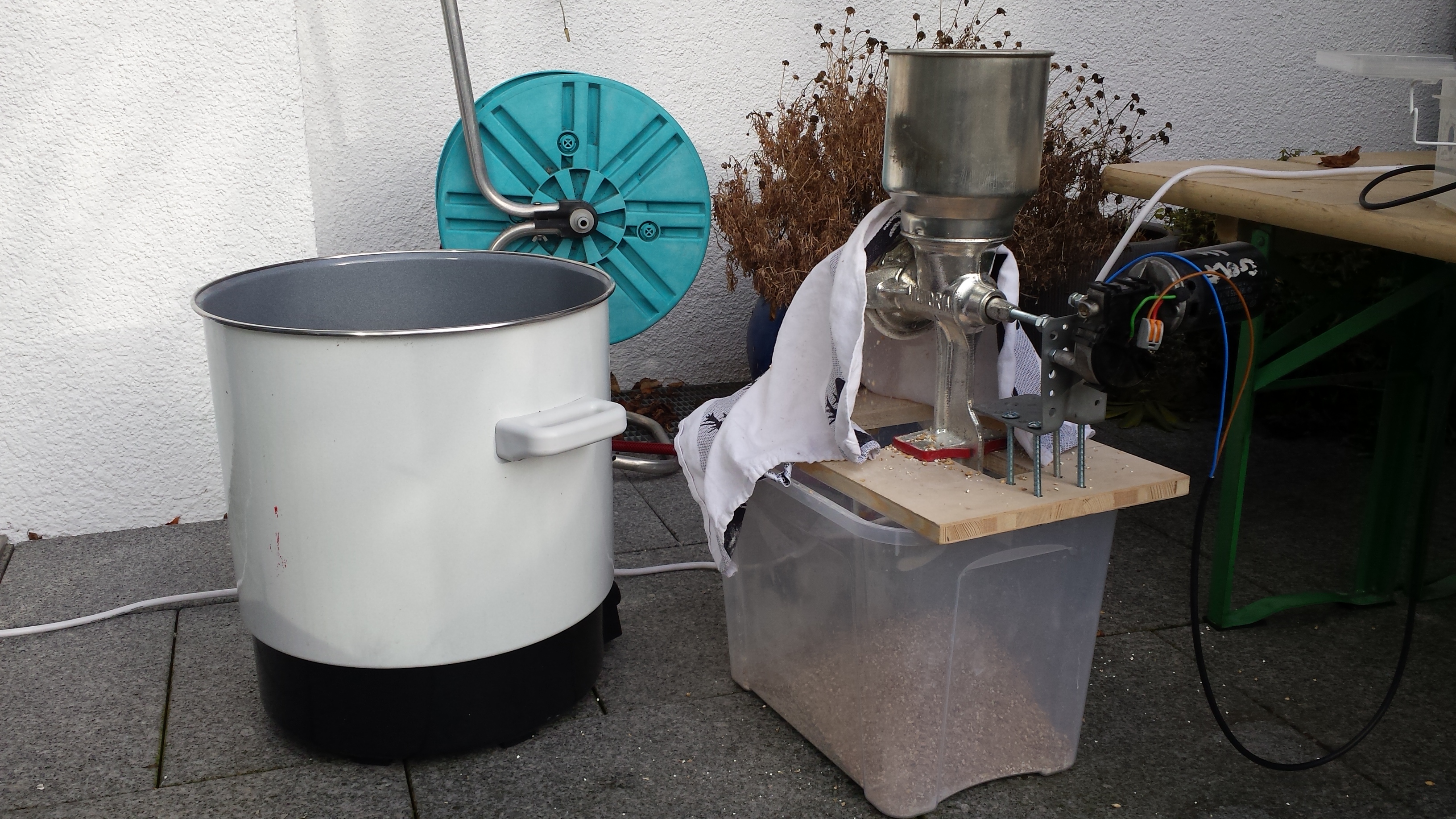 Los ging es dann morgens um 8.00 mit Schroten, dazu habe ich mir im Verlauf des letzten Jahres ein Victoria Malzmühle zugelegt und sie fest auf einem Brett installiert und mit einem Scheibenwischermotor automatisiert. Das Schrotbild der Victoria ist meines Erachtens in Ordnung, etwas fein vielleicht, aber ich habe keine Läuterprobleme, deshalb stört mich das nicht. Während die Mühle das Malz schrotete, wärmte ich im Proficook, der mittlerweile mein Maischbottich ist, den Hauptguss auf. Eine weitere Verbesserung stellt mein erst kürzlich vervollständigtes selbstgebautes Rührwerk dar. Diese durchmischt die Maische extrem gut, die Temperaturunterschiede waren innerhalb des Topfes, egal wo ich gemessen habe, niemals höher als 0,2°C, außerdem brauche ich jetzt nicht mehr die ganze Zeit neben dem Einkocher zu stehen und zu rühren, sodass während der Maltoserast noch Zeit war ein anderes Bauprojekt von mir fortzusetzen: Nach 15 Minuten Verzuckerungsrast war die Maische dann Iodnormal und ich konnte sie umschöpfen in den Läuterbottich (der leider immer noch aus einer Kühlbox besteht, das wird wohl der nächste Teil der Anlage, der verbessert werden wird). Seltsam war beim Läutern dieses Mal, dass ein Teil des Trebers am Anfang nicht absinken wollte, sondern oben aufschwamm
