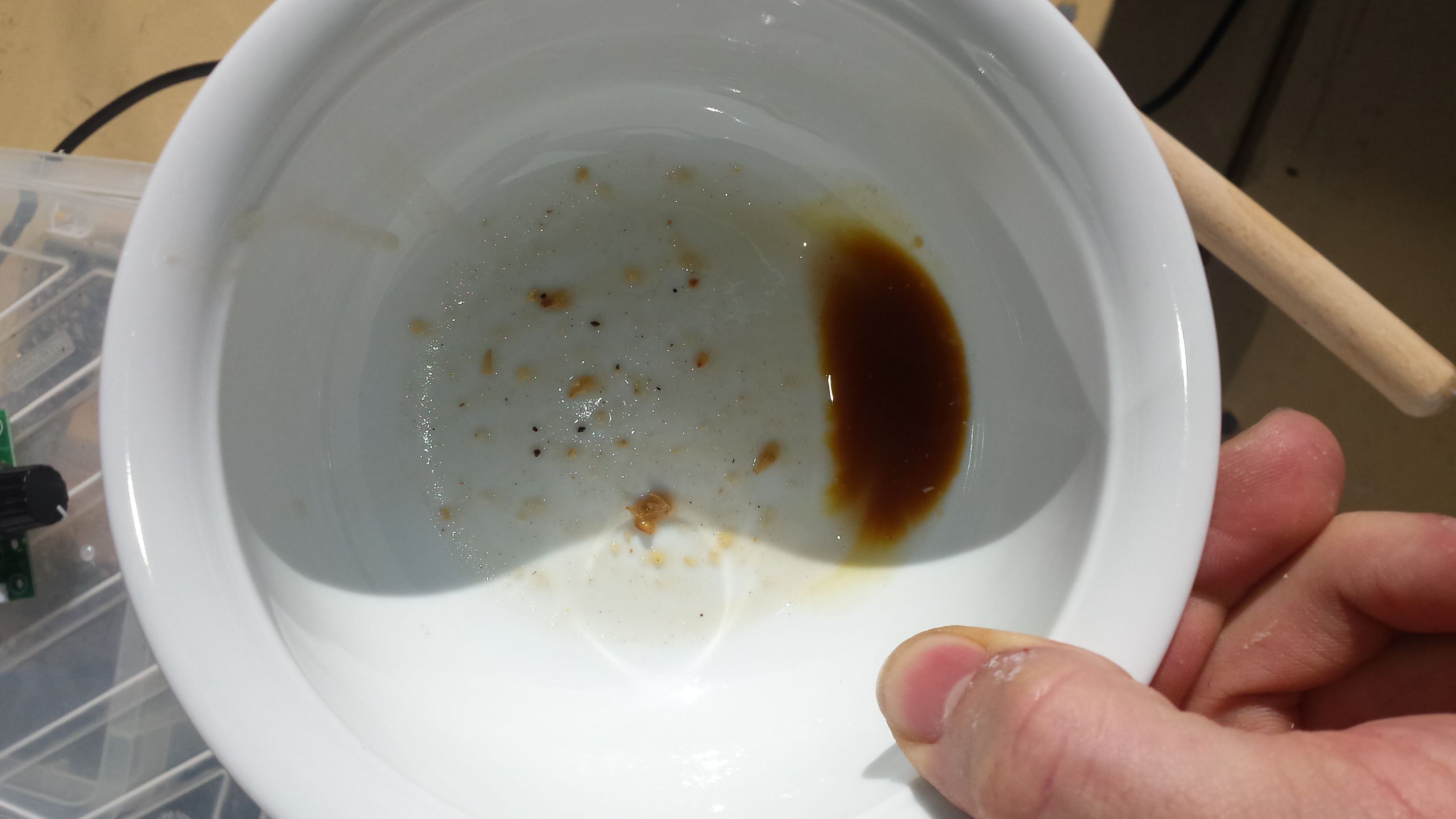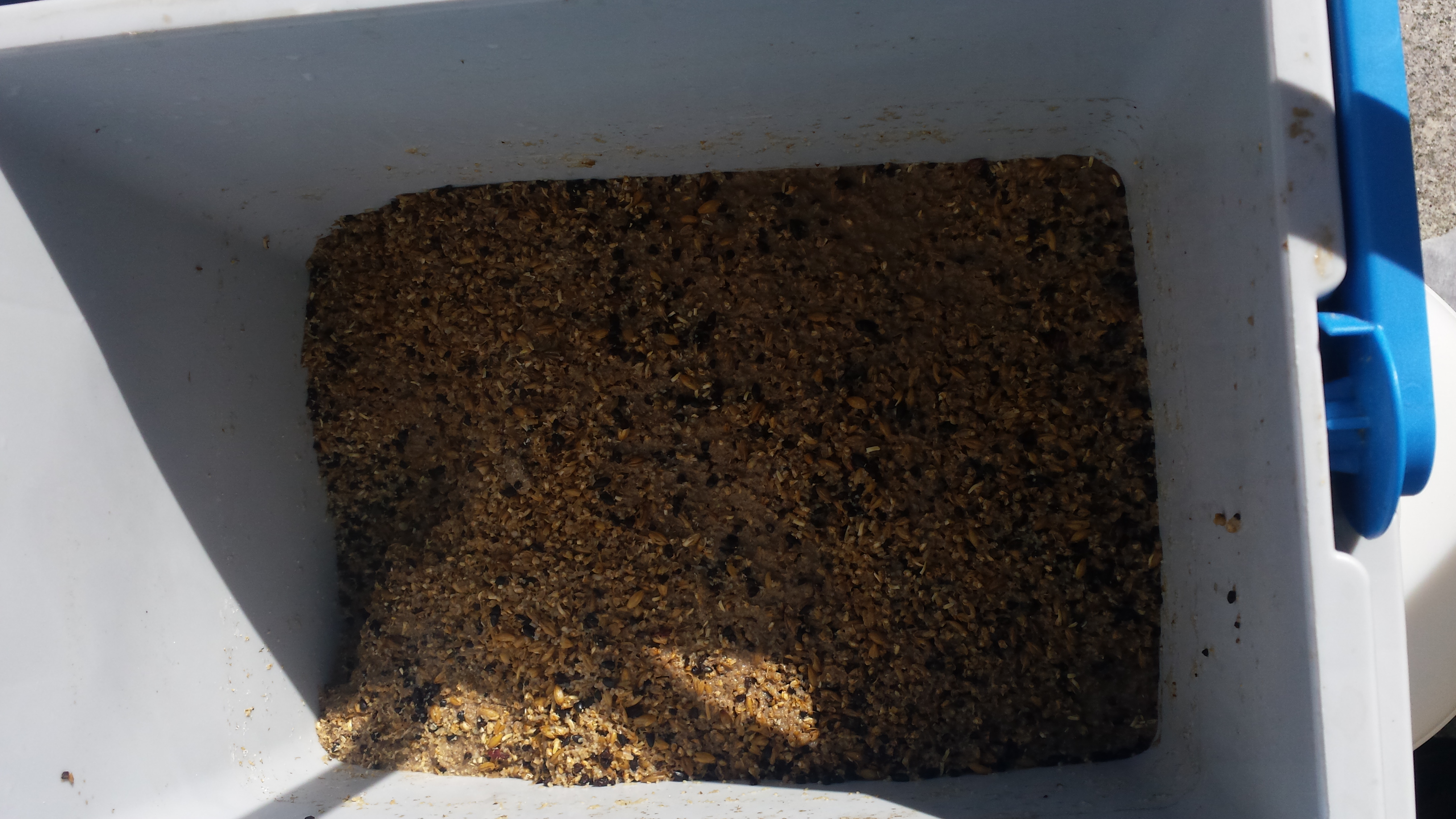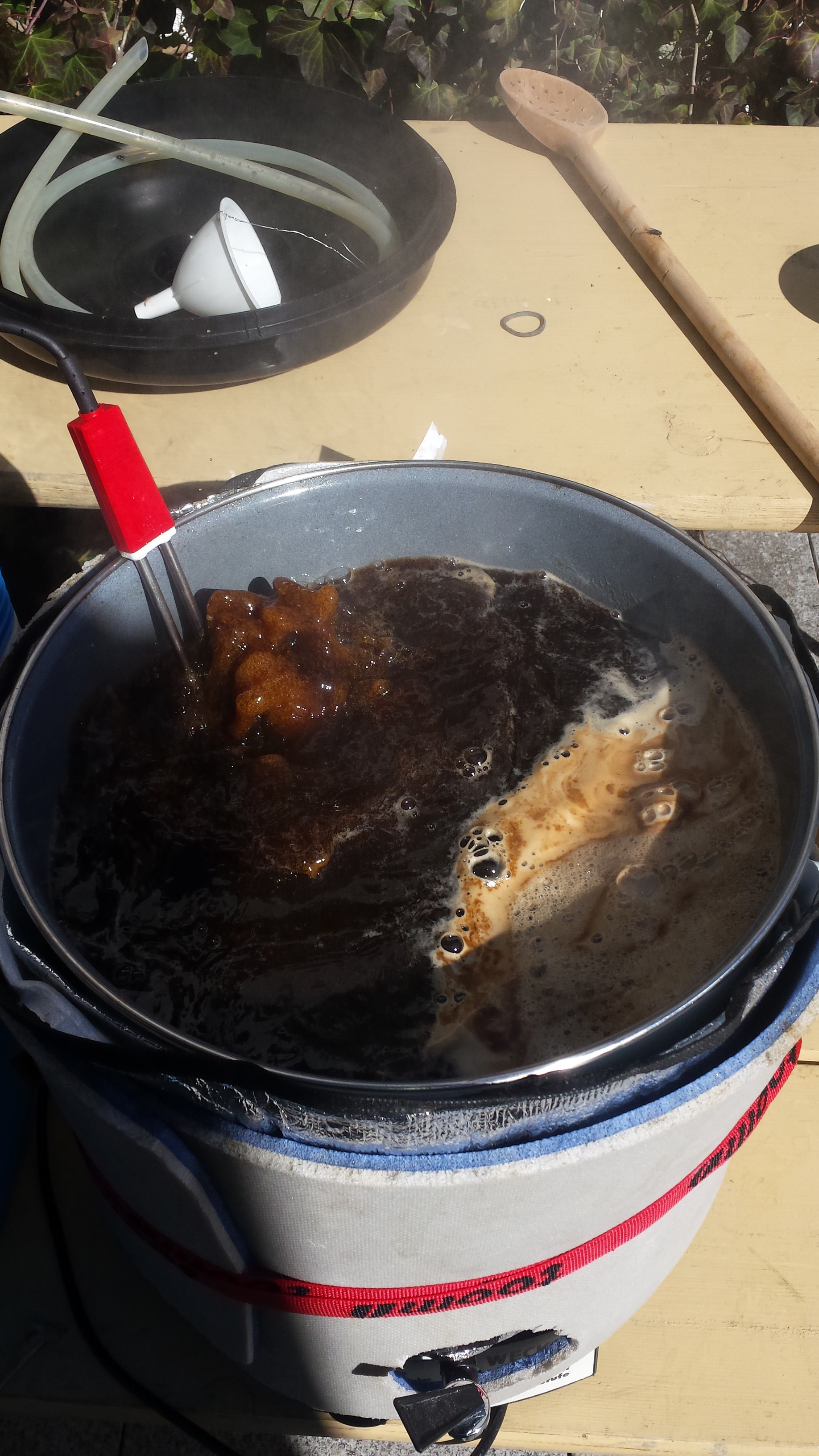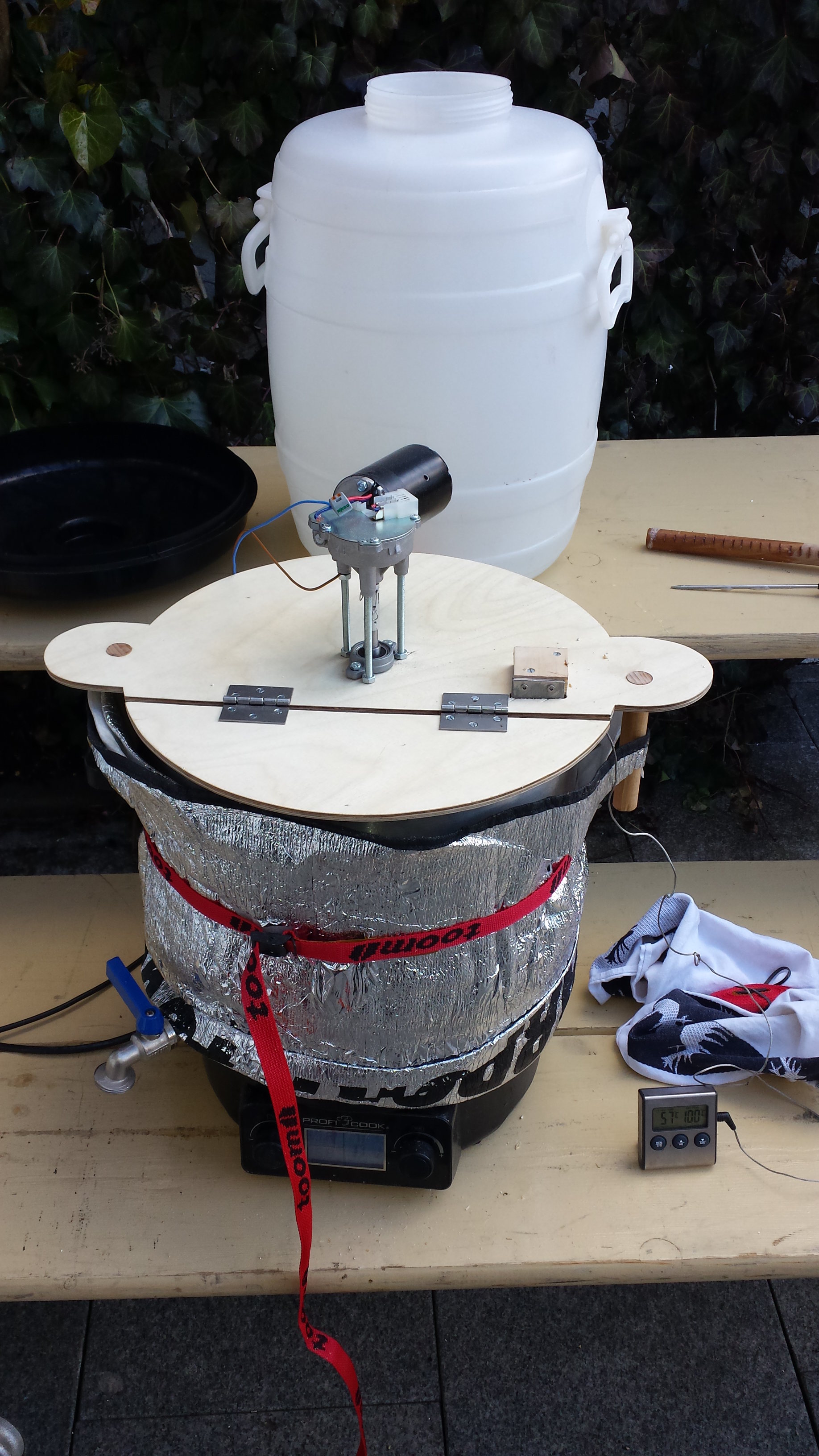 Los ging es dann morgens um 8.00 mit Schroten, dazu habe ich mir im Verlauf des letzten Jahres ein Victoria Malzmühle zugelegt und sie fest auf einem Brett installiert und mit einem Scheibenwischermotor automatisiert. Das Schrotbild der Victoria ist meines Erachtens in Ordnung, etwas fein vielleicht, aber ich habe keine Läuterprobleme, deshalb stört mich das nicht. Während die Mühle das Malz schrotete, wärmte ich im Proficook, der mittlerweile mein Maischbottich ist, den Hauptguss auf. Eine weitere Verbesserung stellt mein erst kürzlich vervollständigtes selbstgebautes Rührwerk dar. Diese durchmischt die Maische extrem gut, die Temperaturunterschiede waren innerhalb des Topfes, egal wo ich gemessen habe, niemals höher als 0,2°C, außerdem brauche ich jetzt nicht mehr die ganze Zeit neben dem Einkocher zu stehen und zu rühren, sodass während der Maltoserast noch Zeit war ein anderes Bauprojekt von mir fortzusetzen: Nach 15 Minuten Verzuckerungsrast war die Maische dann Iodnormal und ich konnte sie umschöpfen in den Läuterbottich (der leider immer noch aus einer Kühlbox besteht, das wird wohl der nächste Teil der Anlage, der verbessert werden wird). Seltsam war beim Läutern dieses Mal, dass ein Teil des Trebers am Anfang nicht absinken wollte, sondern oben aufschwamm