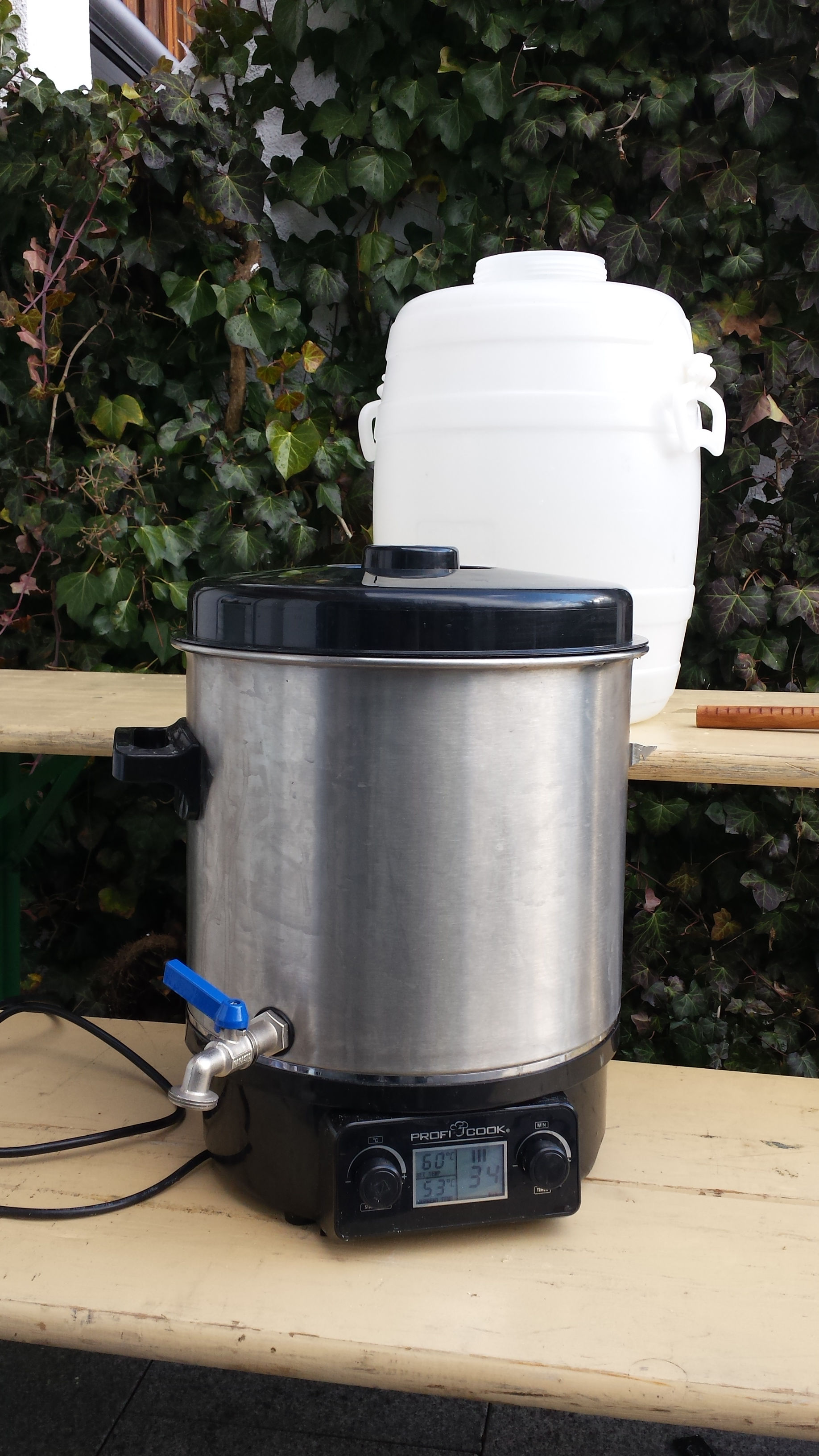 Angefangen habe ich vor etwas weniger als einem Jahr ja mit der "Minimalausrüstung", alter Einkochtopf, bereits geschrotetes Malz, Gärführung mit eingefrorenen Flaschen im leeren Schrank, etc., womit dann auch diese Braudoku meines ersten Sudes zustande kam: viewtopic.php?f=10&t=9385&p=141667#p141667