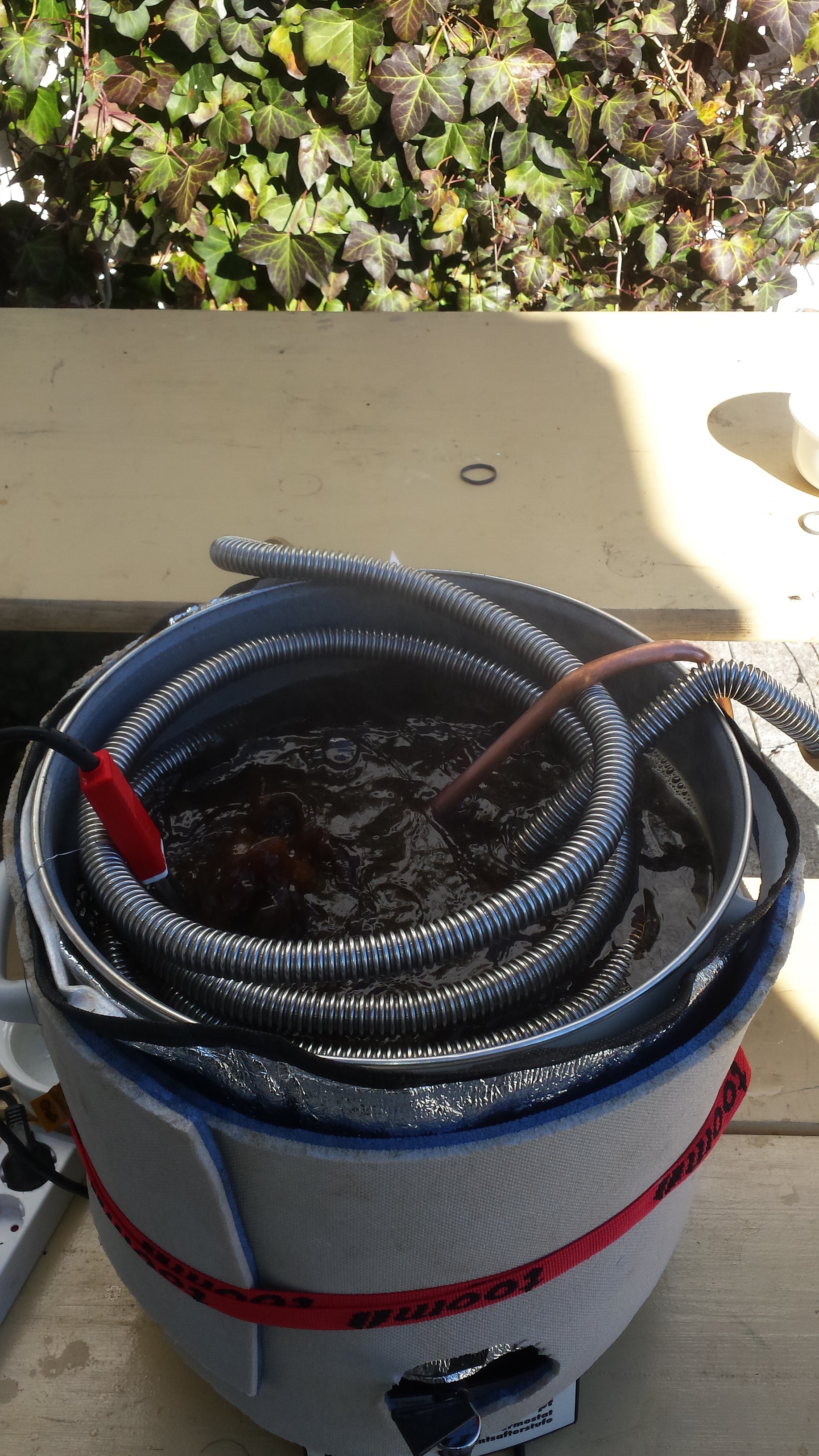 Nach dem ersten Mal Nachguss geben blieb er dann aber brav liegen und ich konnte in Ruhe weiter läutern. Zum Aufheizen zum Hopfenkochen und zur Unterstützung zum wallenden Kochen verwende ich mittlerweile einen Tauchsieder. Die Eiswürfelbad-Kühlmethode habe ich mittlerweile gegen einen selbstgebauten Eintauchkühler aus Edelstahlwellrohr getauscht und bin damit auch sehr zufrieden.
