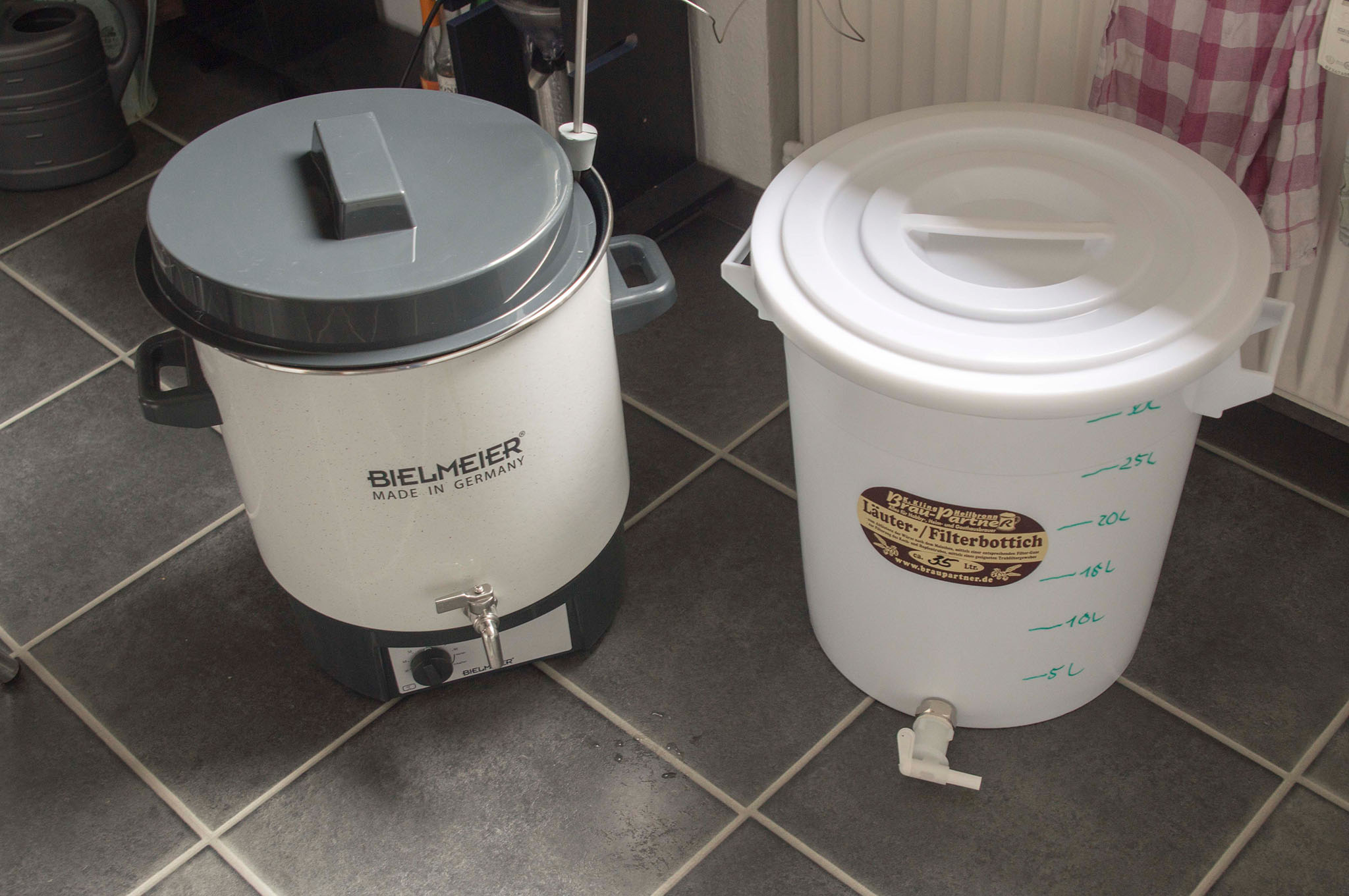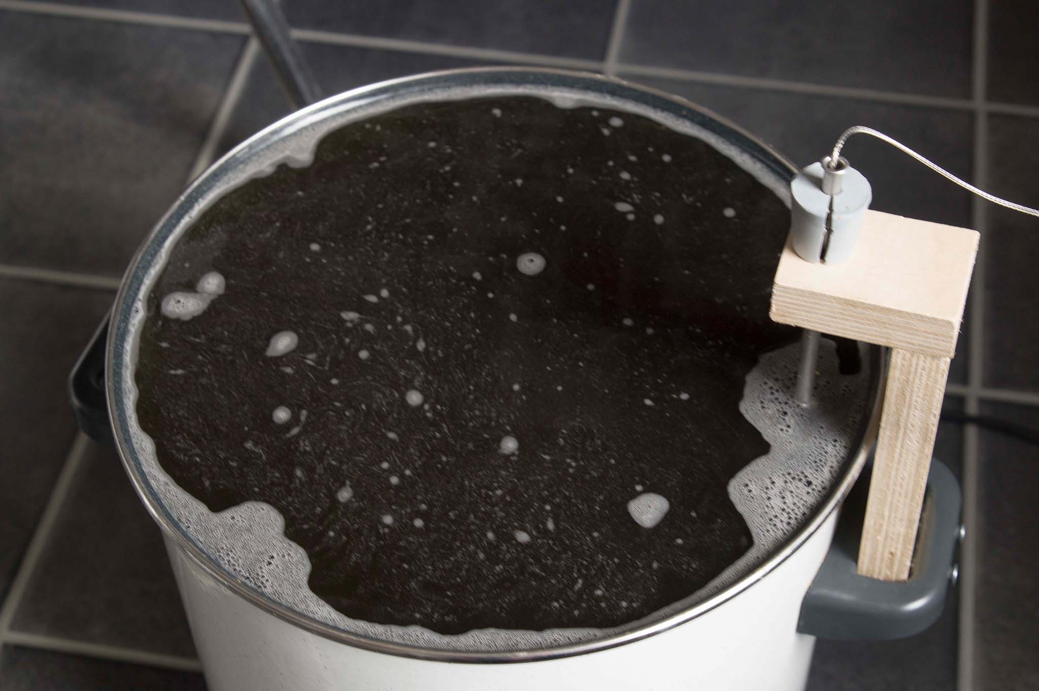 Gebraut wurde folgendes Rezept: Hier mal das Herzstück seiner Brauanlage: Geläutert wird in einem 35L Filterbottich von Braupartner: Hier wurden insgesammt 5,4KG Malz in ~21L Hauptguss eingemascht: Nachdem alle Rasten wie im oben genannten Rezept gefahren wurden, haben wir geläutert. Dazu schöpften wir die Würze in den hier oben stehenden Läuterbottich: Nach zwei Litern Würze lief es schon sehr klar, habe davon leider kein Bild, daher mal hier die Würze im Schlauch, auf dem Weg in die Sudpfanne: Hier zu sehen eine Läuterspindel direkt in der Sudpfanne: Als wir den gewünschten Plato Wert annähernd erreicht hatten (Sudpfanne war voll, daher etwas früher aufgehört): Auf dem Weg zum kochen: Daher hab ich halbherzig ne alte Isomatte drumgelegt, dann ging es langsam bergauf...: Nun hab ich es leider versäumt die ganzen Hopfengaben zu fotografieren, hier aber ein Bild gegen Ende des Hopfen kochens: Hier der Aufbau zum Hopfensaien: Der angedrehte Whirlpool: Hier erscheint langsam der Trubkegel: Hier der Trubkegel am zerfallen: Angestellt wird das ganze nachher mit der Maisels Weiße Strip Hefe. Bin da sehr gespannt, habe bisher noch nie gestript. Scheint aber ganz gut funktioniert zu haben