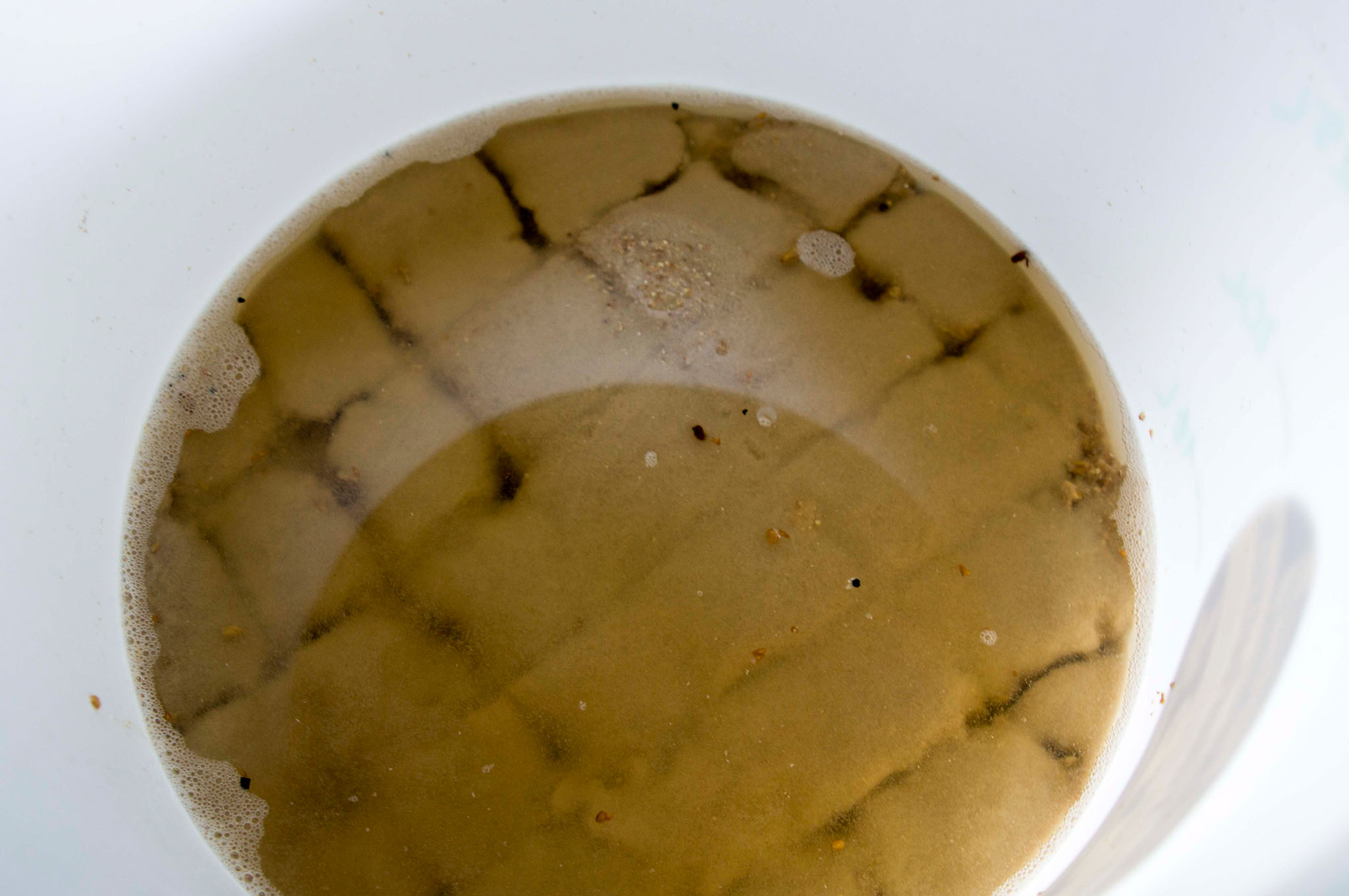 Damit das beim Ablasssen nach dem Kochen nicht so plätschert. Silikonschlauch an den Hahn und den Filter in den Eimer geben. So eine Federzwinge leistet da gute Dienste.