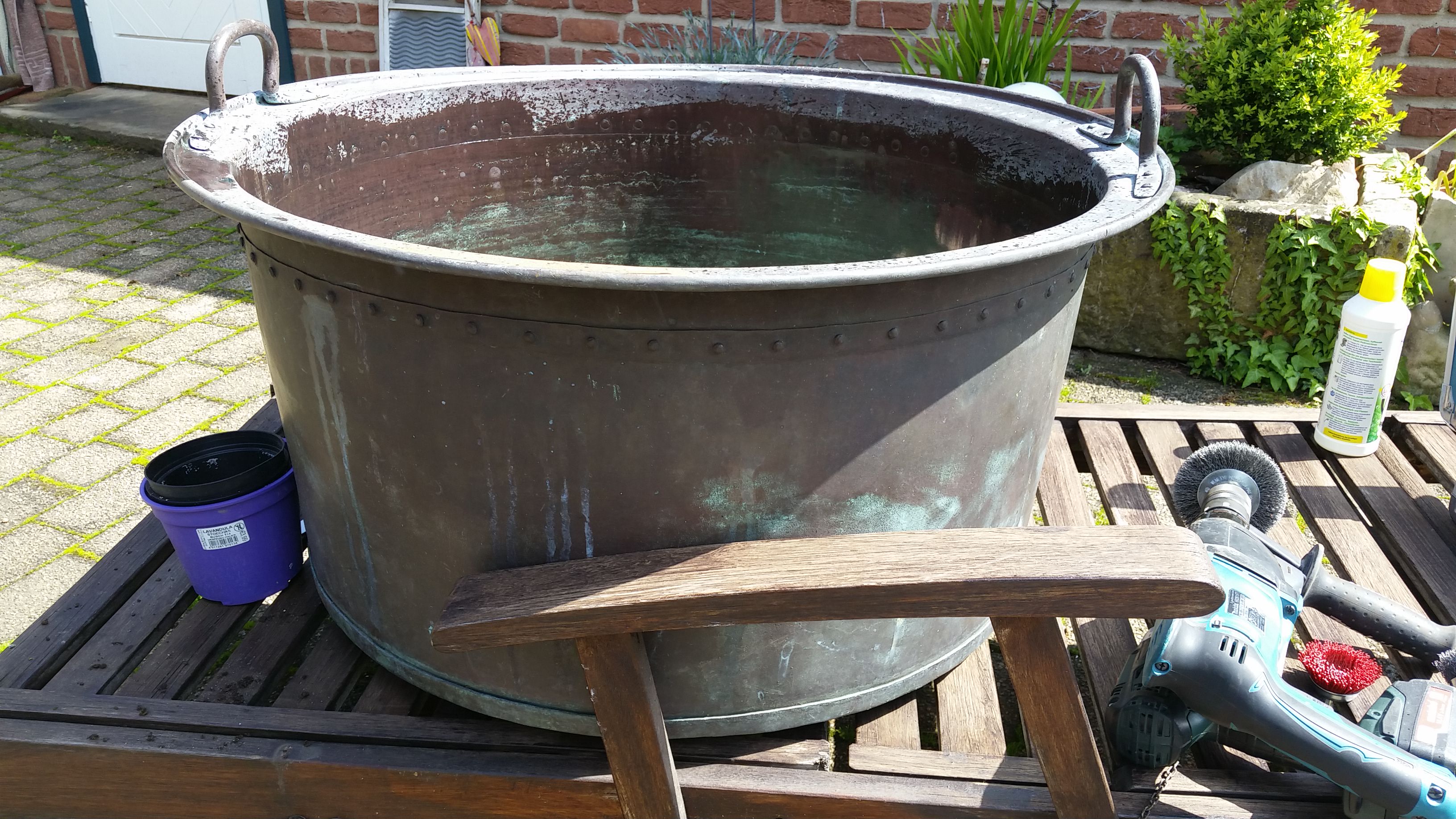 Bedauerlicherweise hat ein sehr intelligenter Mensch mit der Flex in den Boden Schlitze eingeschnitten, um überschüssiges Wasser ablaufen zu lassen....naja.....schade drum. Mittlerweile dienen die geschlitzten Kessel als Feuerschalen....