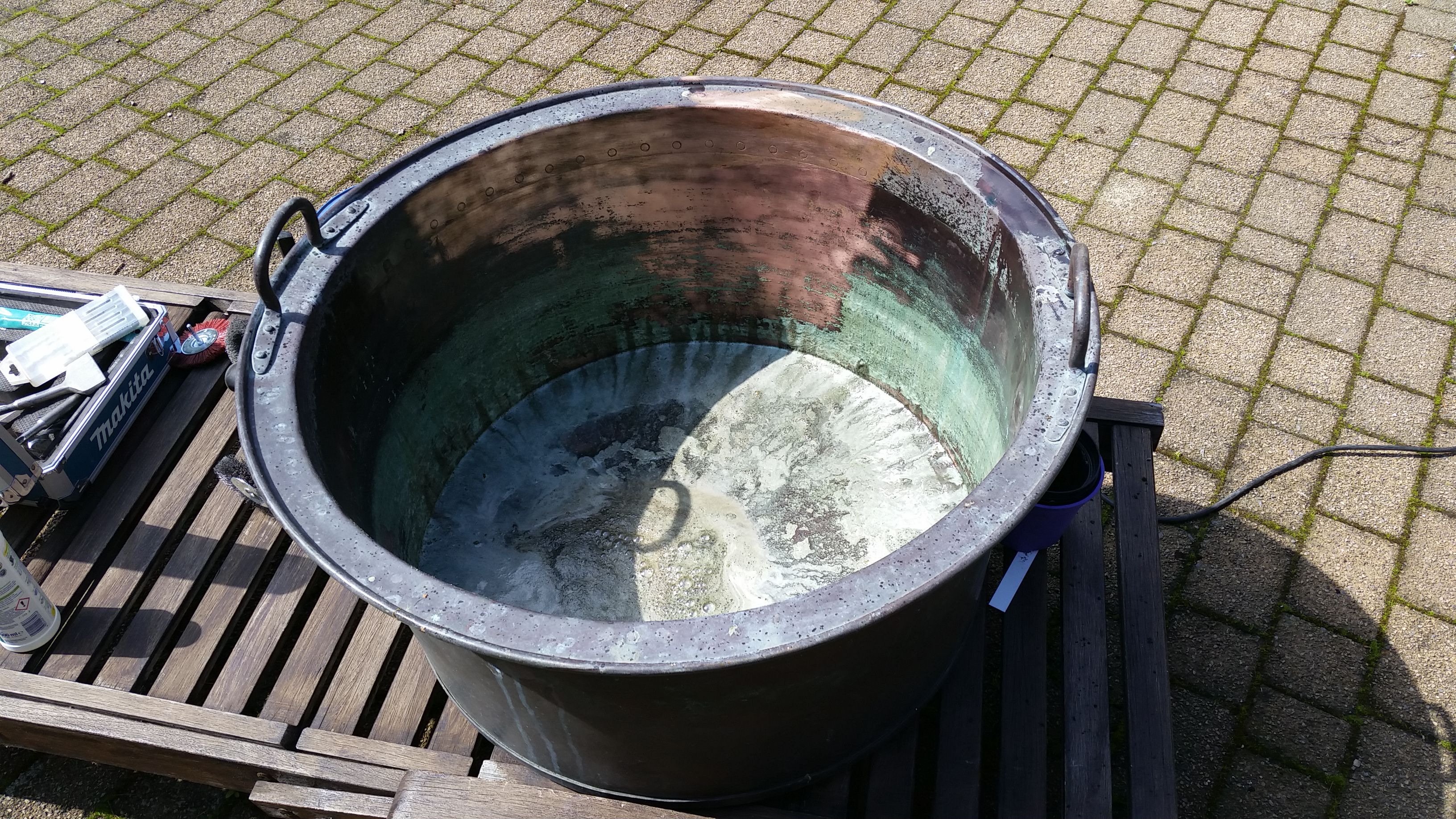 Mir stehen zwei ca. 110l Kupfer Kessel zur Verfügung. Manchmal muss man einfach Glück haben!