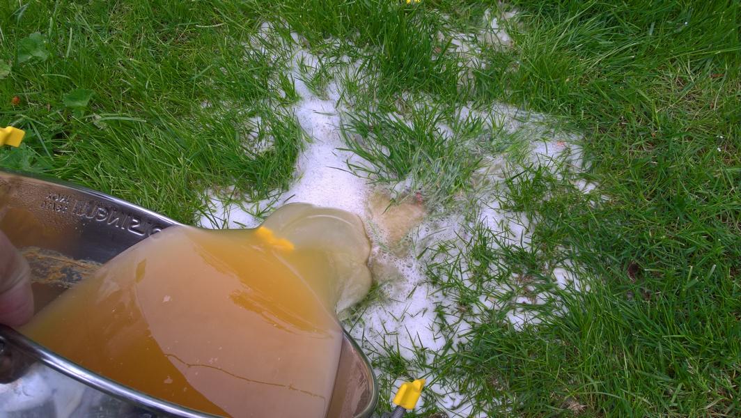 Gut das es ausgegoren war. Sonst hättest Du jetzt noch zu allem Überfluss einen Hummelschwarm auf der schönen Wiese. Die paar Prozent Restextrakt und der Alk werden hoffentlich nur die Regenwürmer zu einer spontanen Party einladen :Drink.