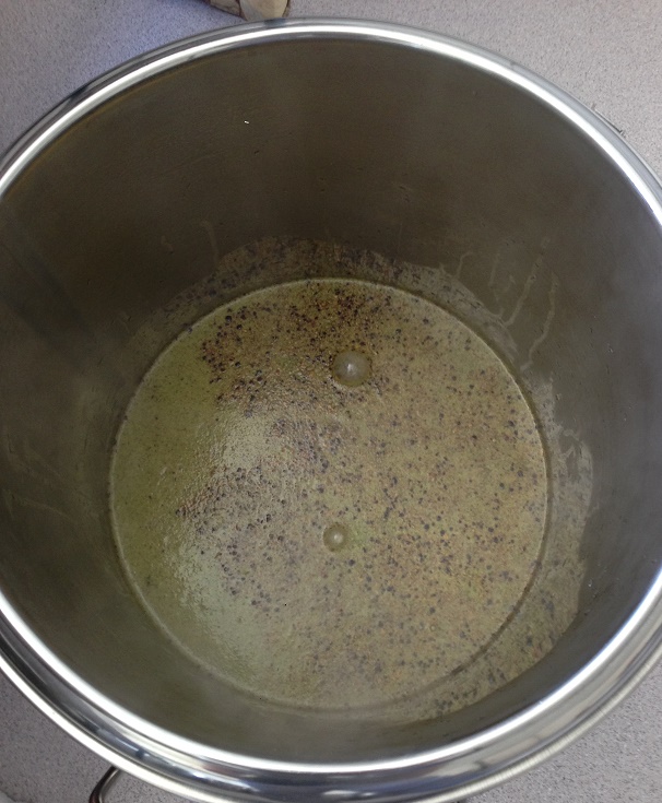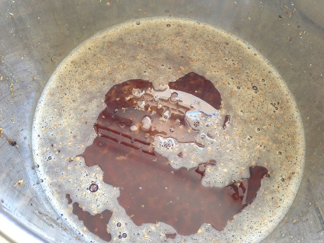 Ab jetzt begann ein großer Leidensweg. Es kam nahezu nichts mehr. 3L Nachguss kamen dazu, und es kam nur Mililiterweise. Nochmal gestoppt, zurückgeschüttet, nochmal 30 Minuten Ruhe. Inzwischen bemerke ich, die Läuterhexe liegt irgendwo zwischen der Maische und weder in Form, noch am Boden. Problem gefunden? Keine Ahnung, es geht einfach kaum was. Nach hundert mal einschneiden des Trebers, habe ich irgendwann 10 Liter mit 21 Brix gewonnen. Somit konnte ich nicht verdünnen, und eben in Kauf nehmen, dass da nicht mehr draus wird. Naja es ist ein versuch, also damit zufrieden geben, nochmal die Pennywise CD anschwerfen und ein weiteres Weizen vernichten (Dabei bemerke ich erschreckend, dass ich um 12 Uhr Mittags schon zwei getrunken habe..) EGAL. Dann habe das Ganze für 10 Minuten der Sterlität wegen aufgekocht und dann habe ich sauber gemacht und die paar Liter zum abkühlen in den Keller getan. Hopfung gibts hier keine mehr. Nach ein paar Stunden kam Backhefe (ja wirklich...... die soll sogar wichtig sein, sagt man in Finnland). Nach kurzer Zeit gärte es schon gut und sah so aus: