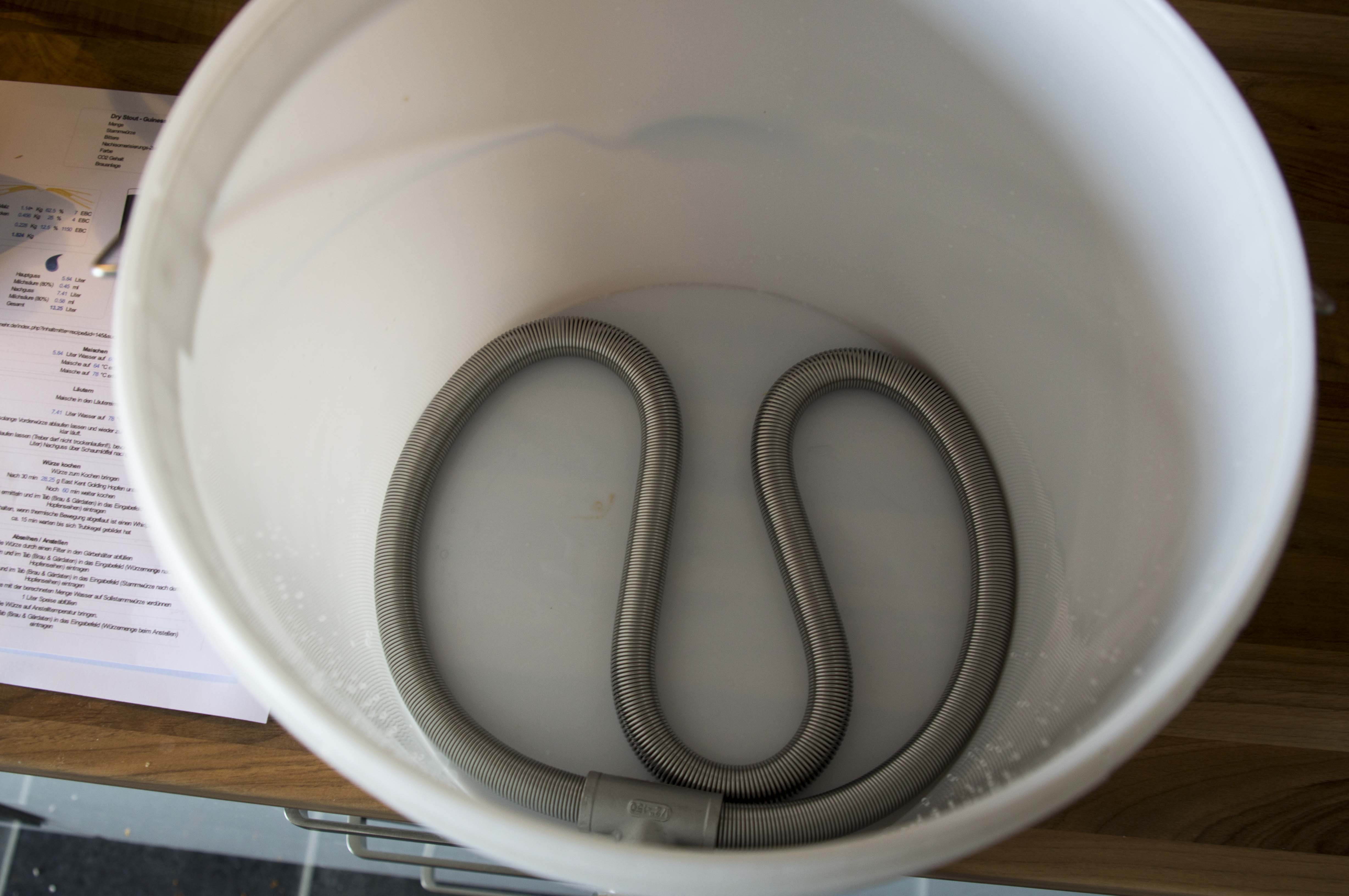 Kühlen tue ich normalerweise mit nem 20m Würzekühler. Da dieser aber weder in die "Sufpfanne" noch in den kleinen Gäreimer passt, bin ich wie folgt vorgegangen: