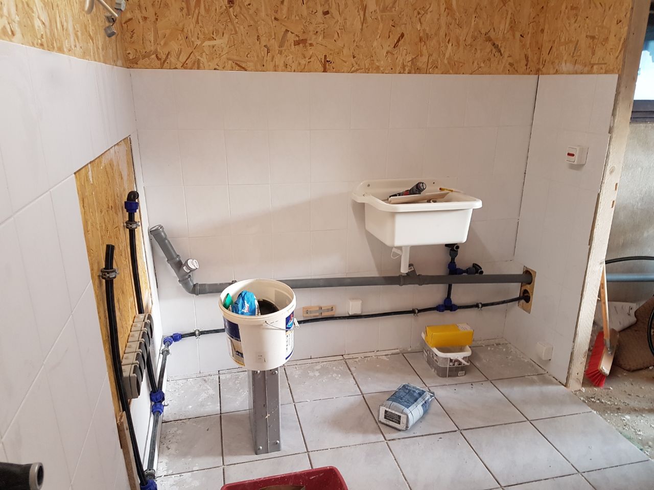 Wände und Boden sind jetzt alle gefliest und verfugt, Silikonfugen wurden auch alle gemacht. OSB Platten sind versiegelt und lackiert.