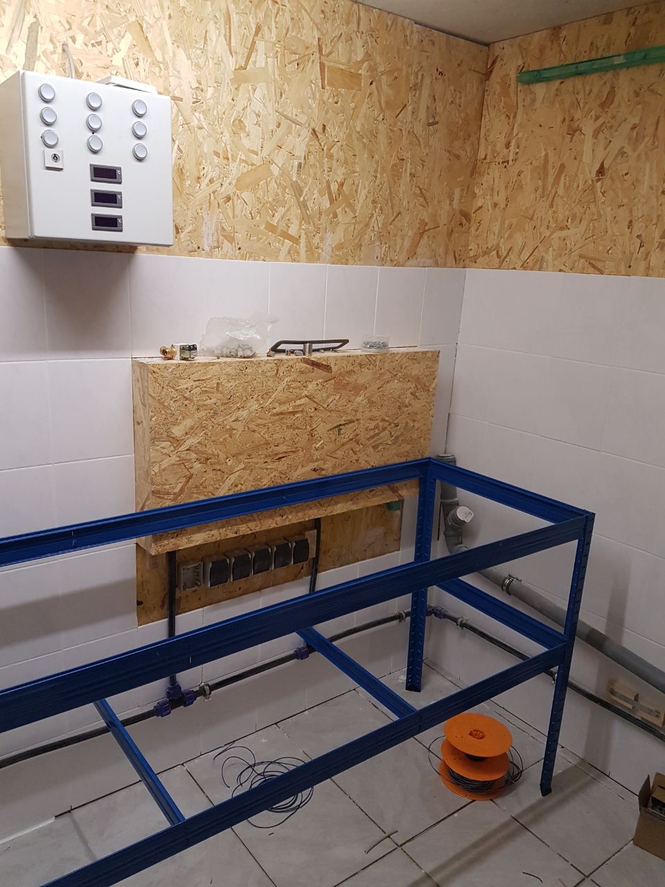 Wände und Boden sind jetzt alle gefliest und verfugt, Silikonfugen wurden auch alle gemacht. OSB Platten sind versiegelt und lackiert.