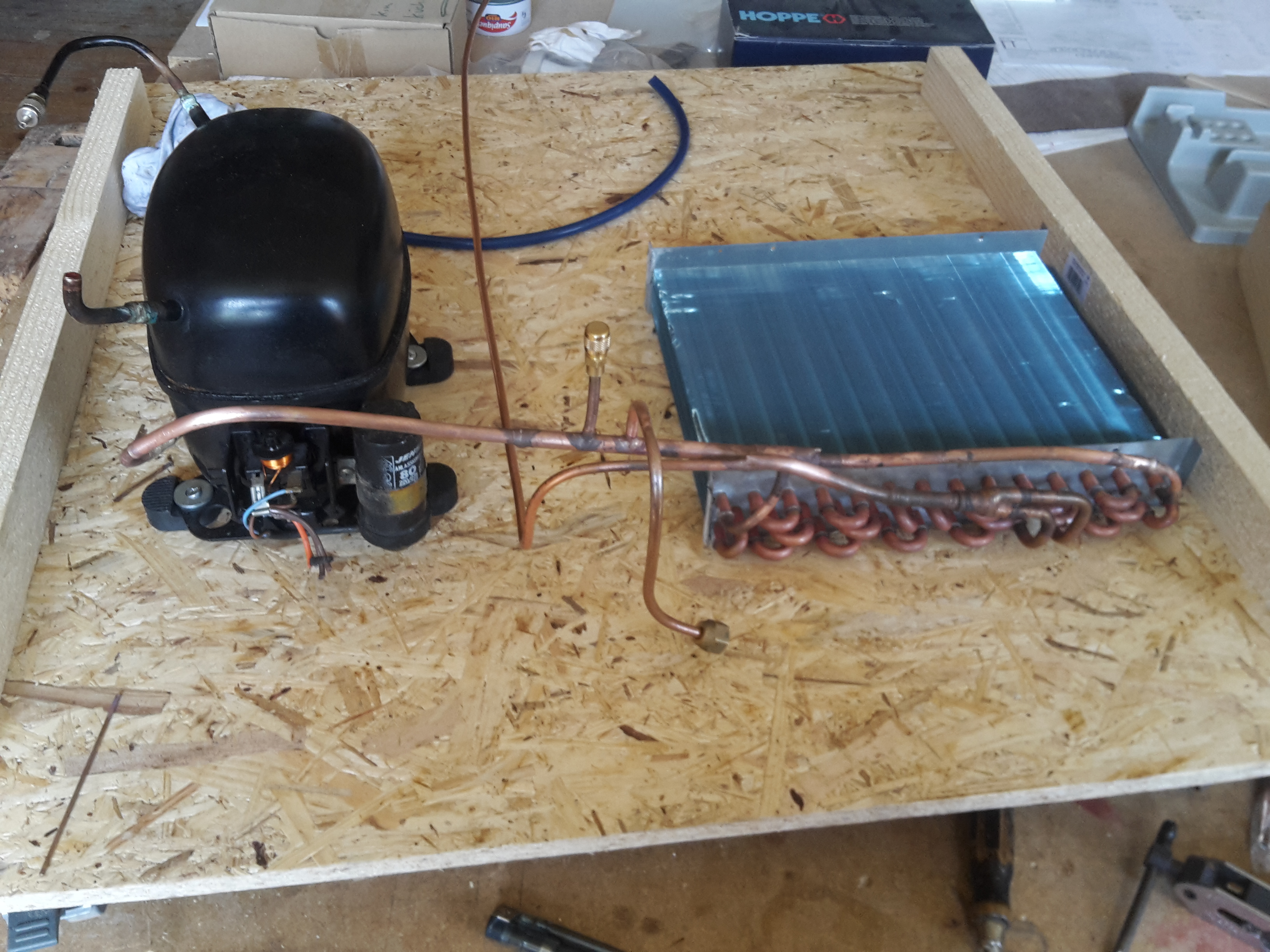 Das Rote ist die Kühlung. Unten Kompressor und Verflüssiger, im Kühlteil der Verdampfer mit den beiden Lüftern auf der Oberseite. Darunter wird noch eine Abtropfschale für das Kondenswasser angebracht.