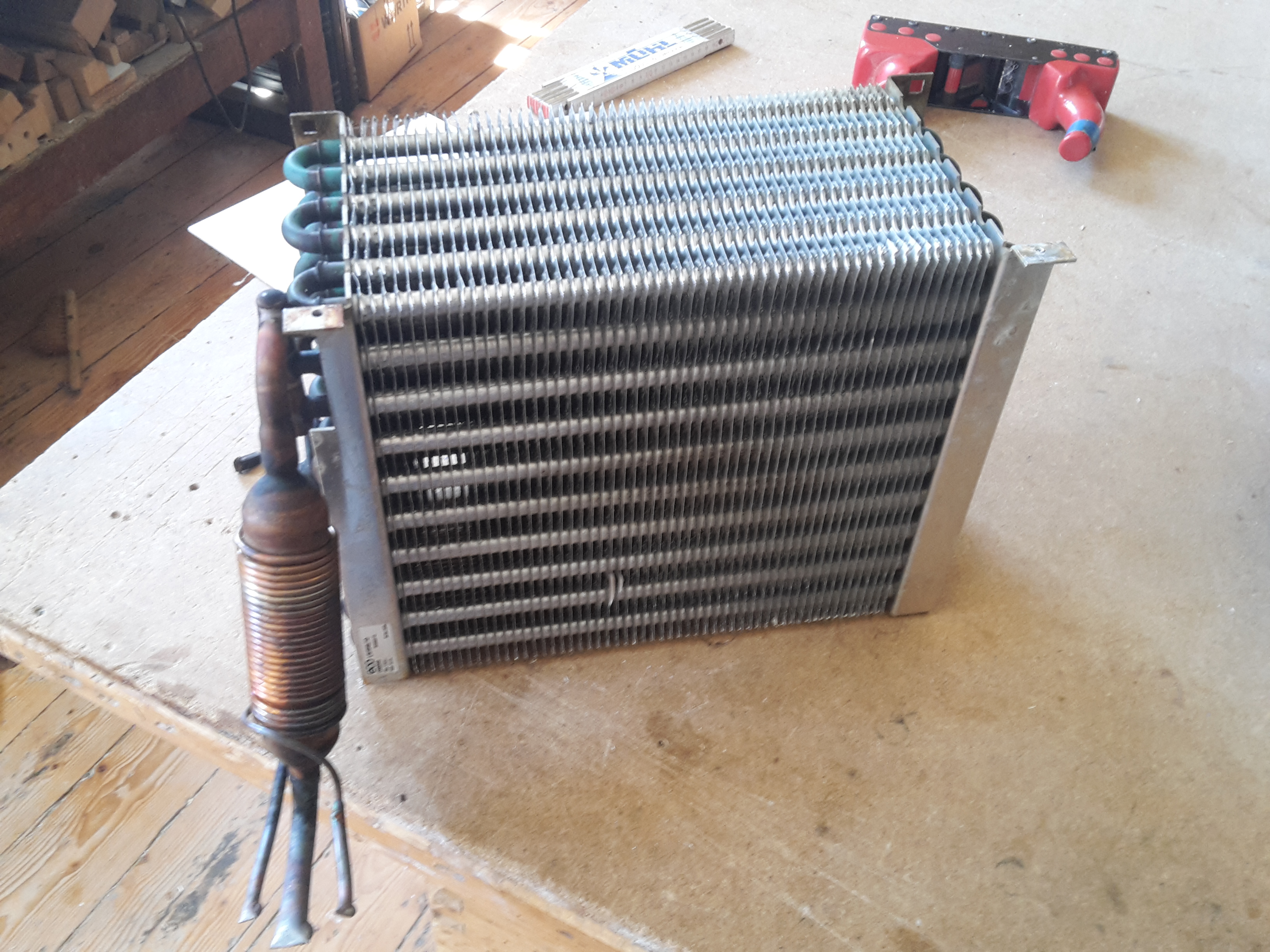 Das Rote ist die Kühlung. Unten Kompressor und Verflüssiger, im Kühlteil der Verdampfer mit den beiden Lüftern auf der Oberseite. Darunter wird noch eine Abtropfschale für das Kondenswasser angebracht.