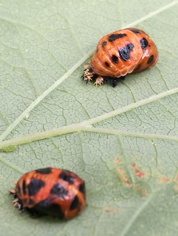 Das sind die Puppen des Marienkäfers. Die entwickeln sich noch zu richtigen Käfern. Sehr gute Blattlausvertilger.