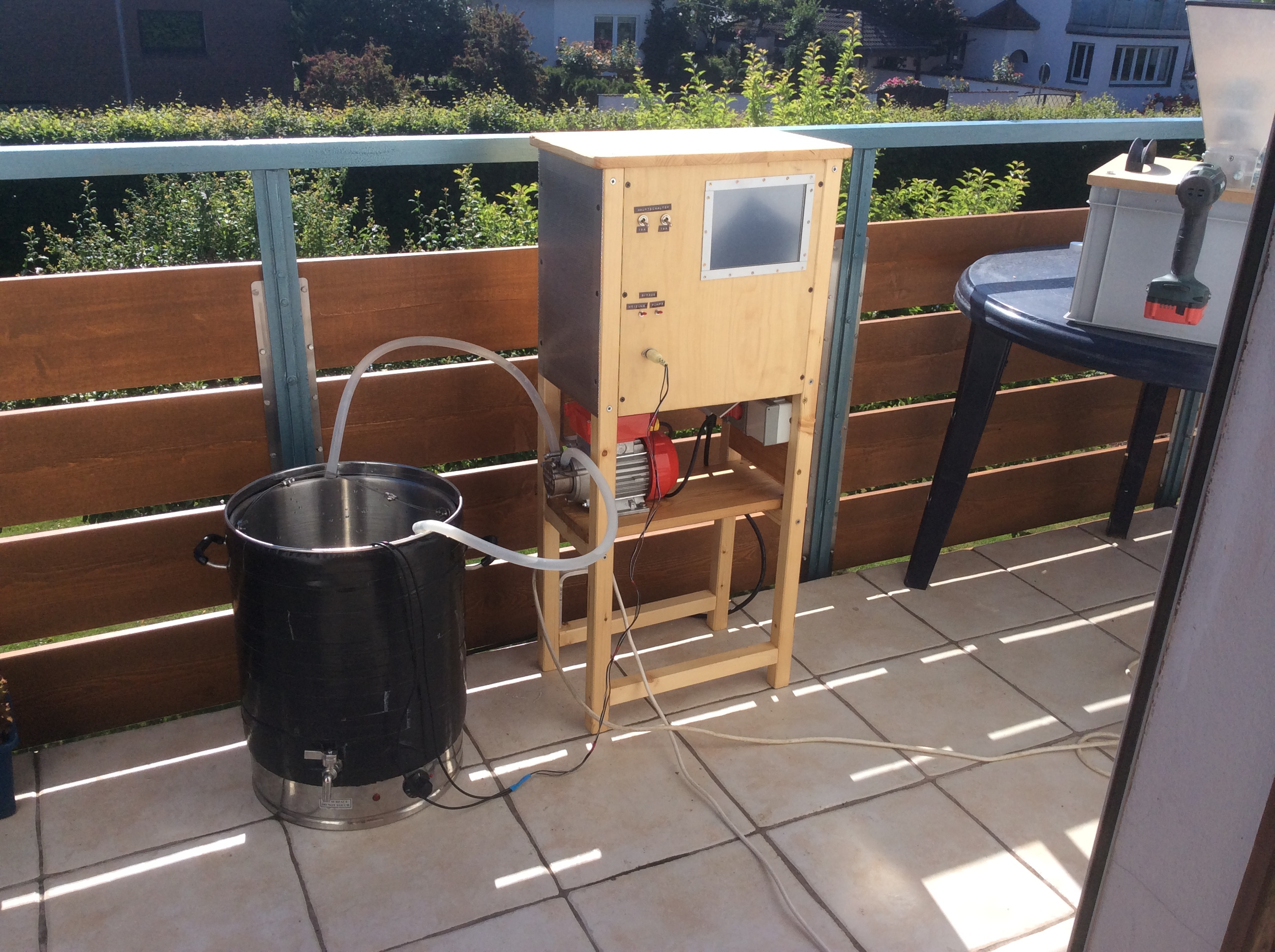 Ich hatte gerade meine Brauanlage fertig gebaut und wollte damit nun den ersten Sud machen. Also, fertig war sie schon länger, und gebraut habe ich damit auch schon zwei Mal, aber ich hab' jetzt halt alles in ein Gehäuse eingebaut und beschriftet, was in Fachkreisen bekanntlich als Hauptkriterium für "fertig" angesehen wird.