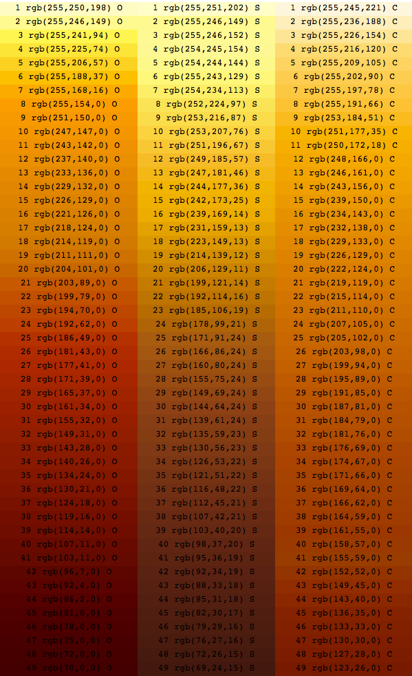 }Hier der Datensatz der den EBC/RGB Zusammenhang herstellt - an erster Position steht der EBC-Wert, die restlichen Positionen beschreiben den RGB-Anteil. Nicht verfügbare EBC-Werte werden innerhalb der Rechenlogik interpoliert: