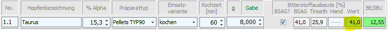 - 1.2 zeigt einen "Mittelwert", den du als "Stammsatz" im Rezeptkontext für Bitterstoffausbeuten festgelegt hast(BSAG=Bitterstoffausbeute Gesamt) - als Vorschlag (29%)