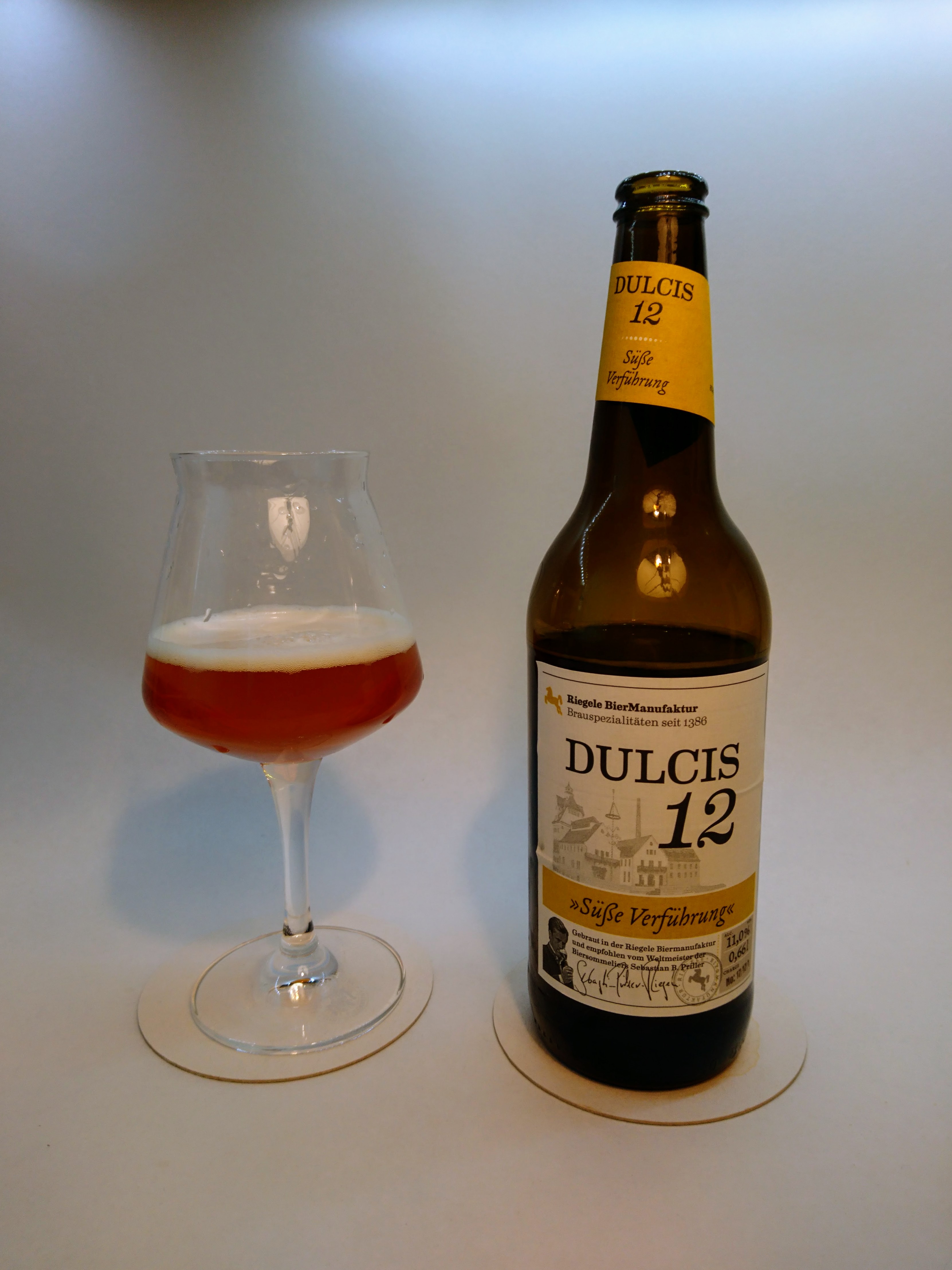 Dulcis 12, (dulcis lateinisch: süß, 12: zweite 12 monatige Gärung) „Süße Verführung“. Riegele ordnet das Bier im Dubbel Bereich ein, ich sehe das eher als Triple.