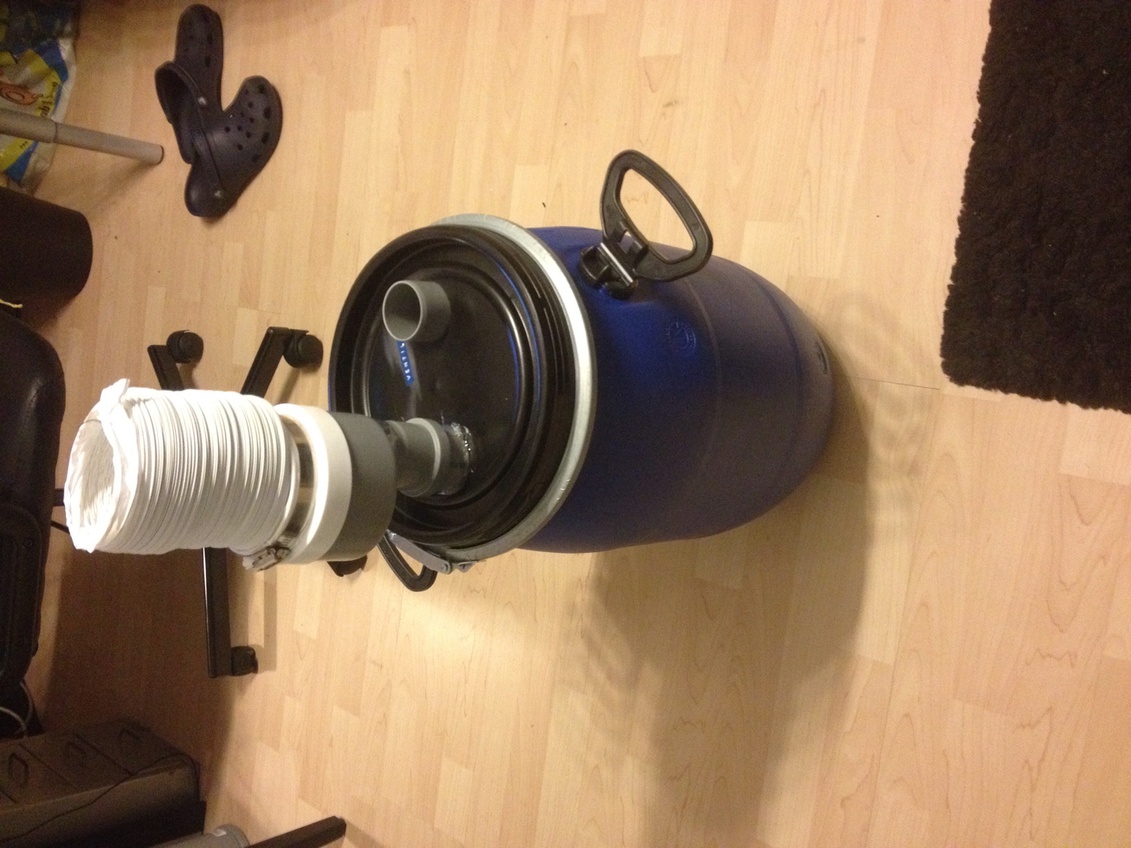 Ein 30l Fass mit zwei 50mm Bohrungen. Dieses ist mit ca. 20l Wasser gefüllt. Links sieht man den Schlauch der später zur eigentlich Abzugshaube führt, darunter ein Reduzierstück. Das ganze hängt an einem 50mm HT Rohr welches bis auf den Fassboden reicht. Dort macht es einen 90° Knick. Hieran ist ein flexibler HT Schlauch kreisrund am Fassboden verlegt. In diesen habe ich Löcher gebohrt um mehr Blasen zu erzeugen.