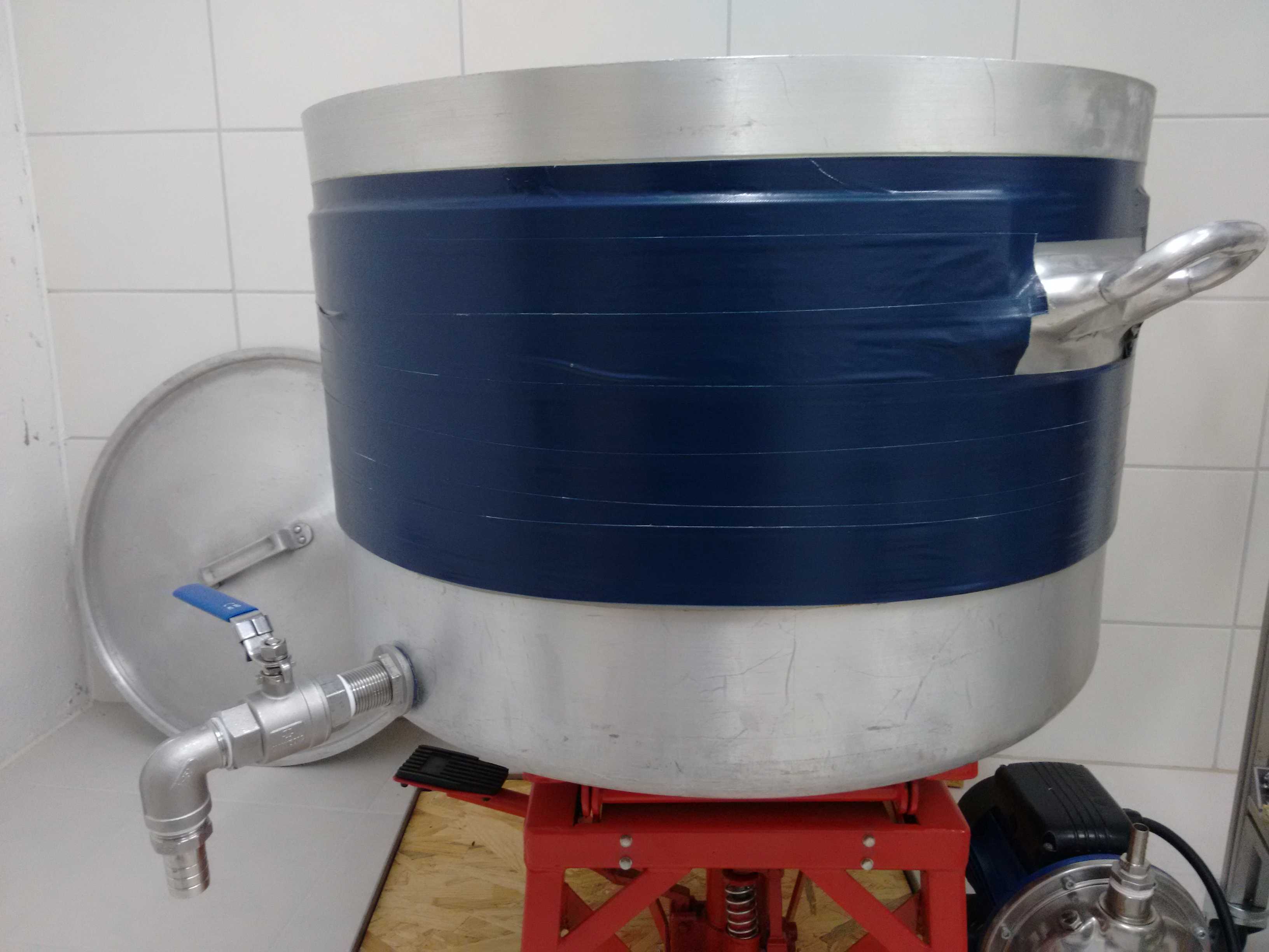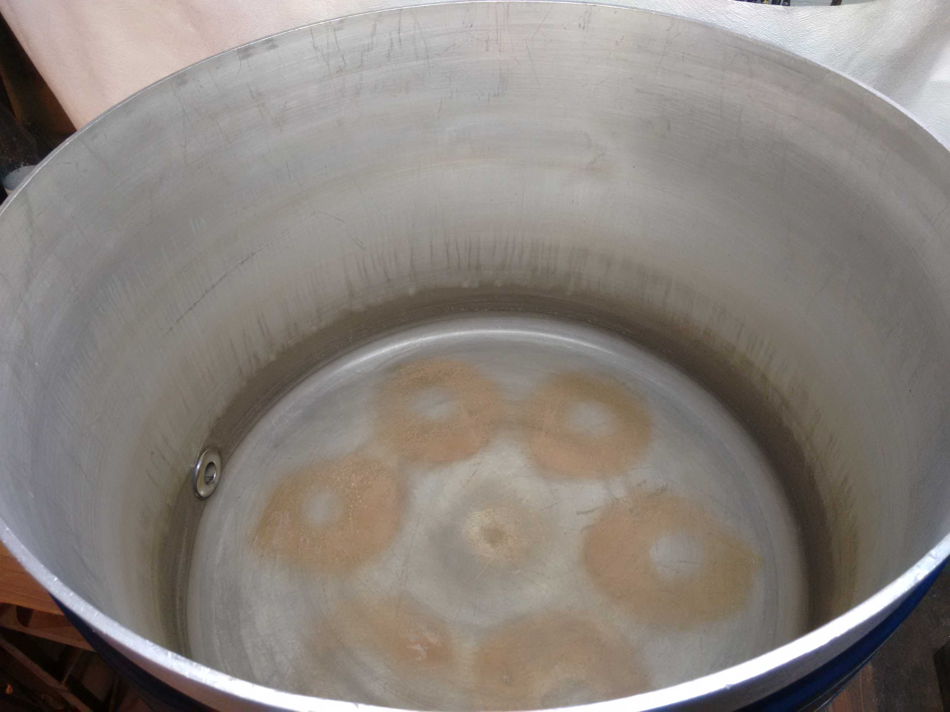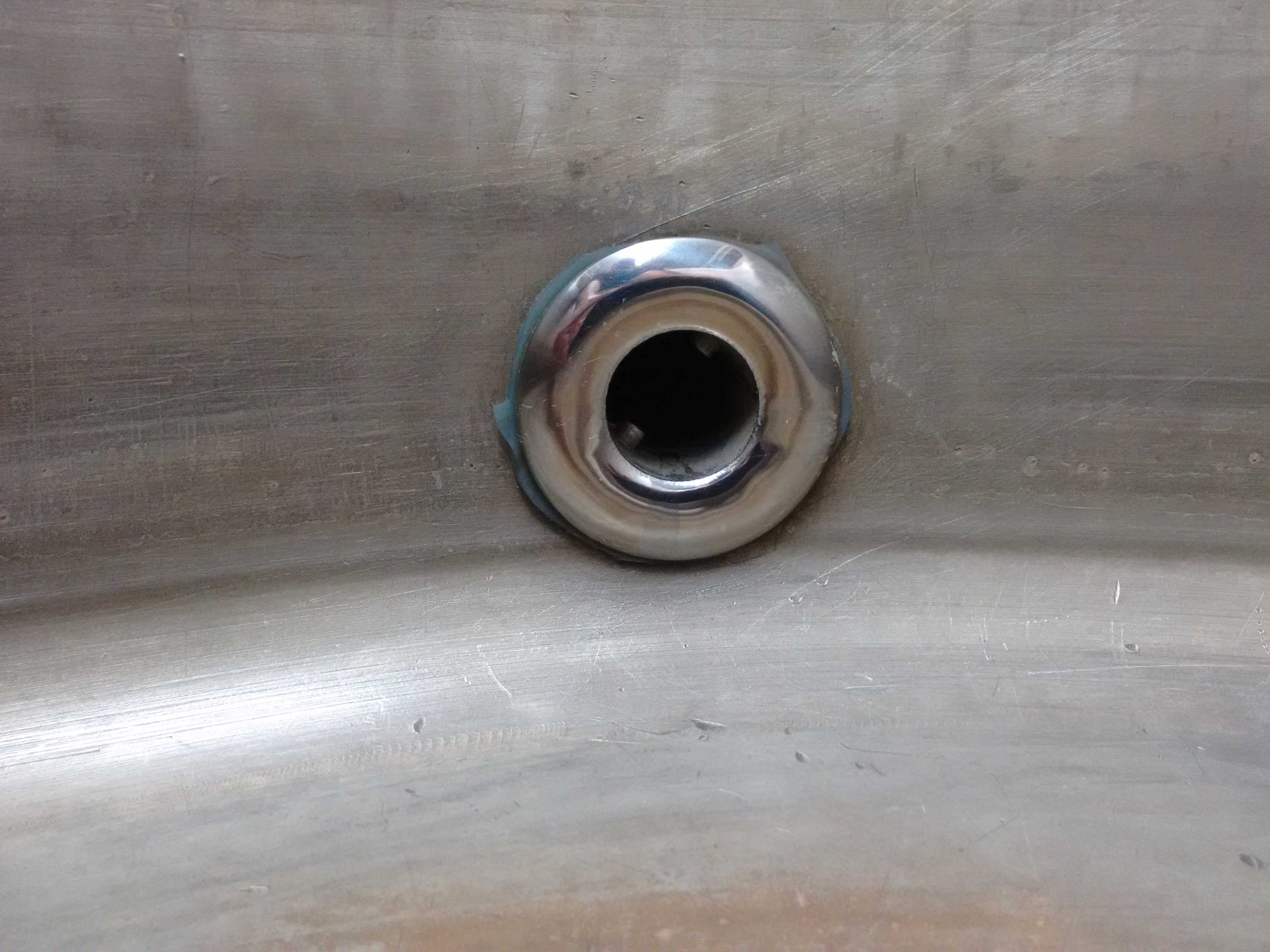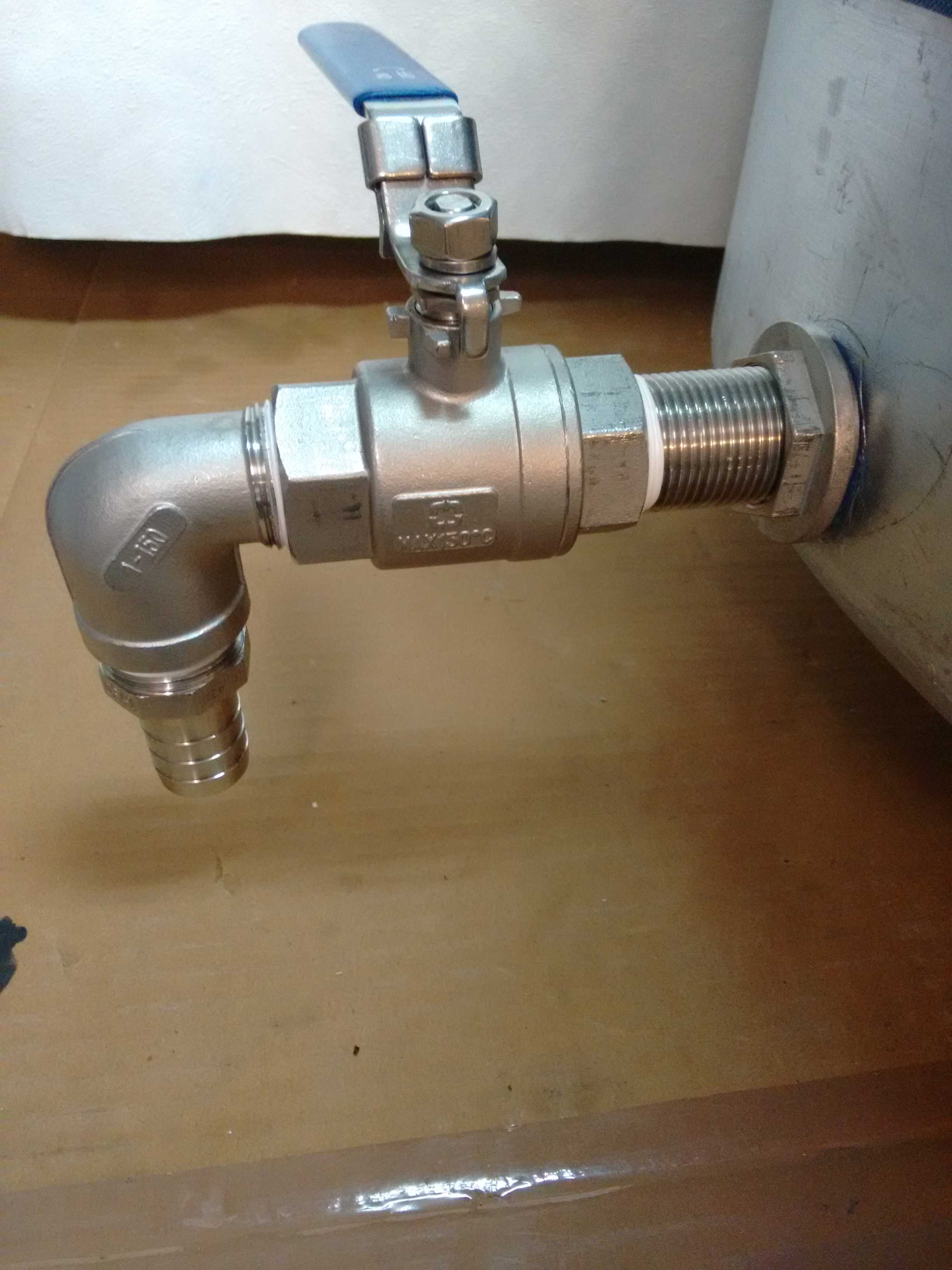 Als Auslauf ist ein 1"-Bordurchlaß mit 1"-Kugellhahn (DN25; Winkel; Schlauchanschluß) alles aus Edelstahl verbaut.